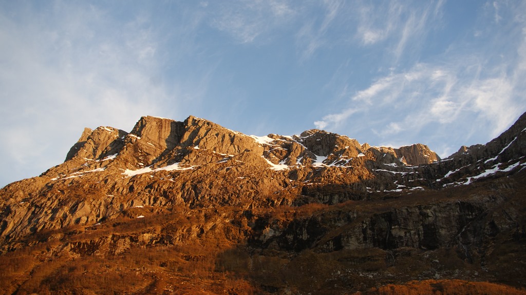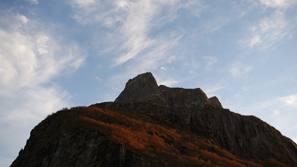 Kommer ner mot Hornelen som är en väldigt hög klippa med fin utsikt från. Sitter även sensorer på klippan som mäter om det är förflyttningar i berget. Det är nämligen en spricka genom hela klippan och om den rasar ner i fjorden så blir det en jättetsunami som kan ta med sig hela Målöy.