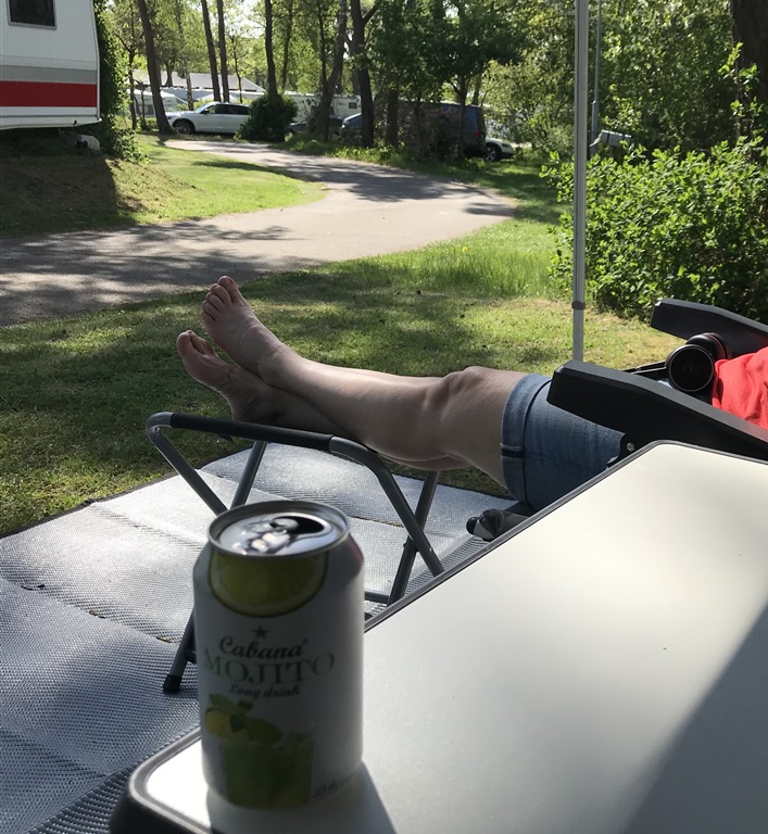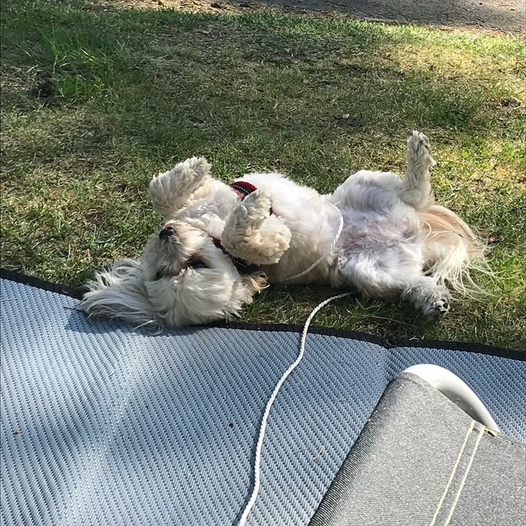 Vi gick tillbaka till campingen och satte oss utanför med lite avsvalkande dricka igen. Chili rullade runt i gräset och stortrivdes.