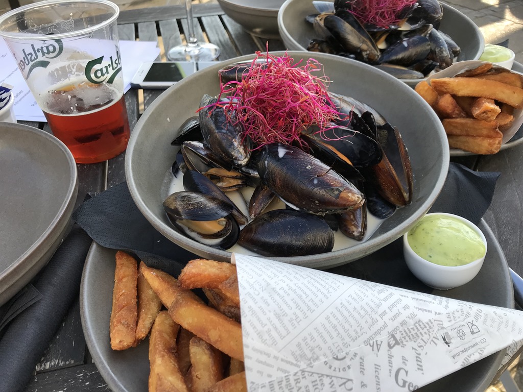 Vid 19 tiden går vi bort till restaurangen och beställer varsin tallrik med musslor. ![]()