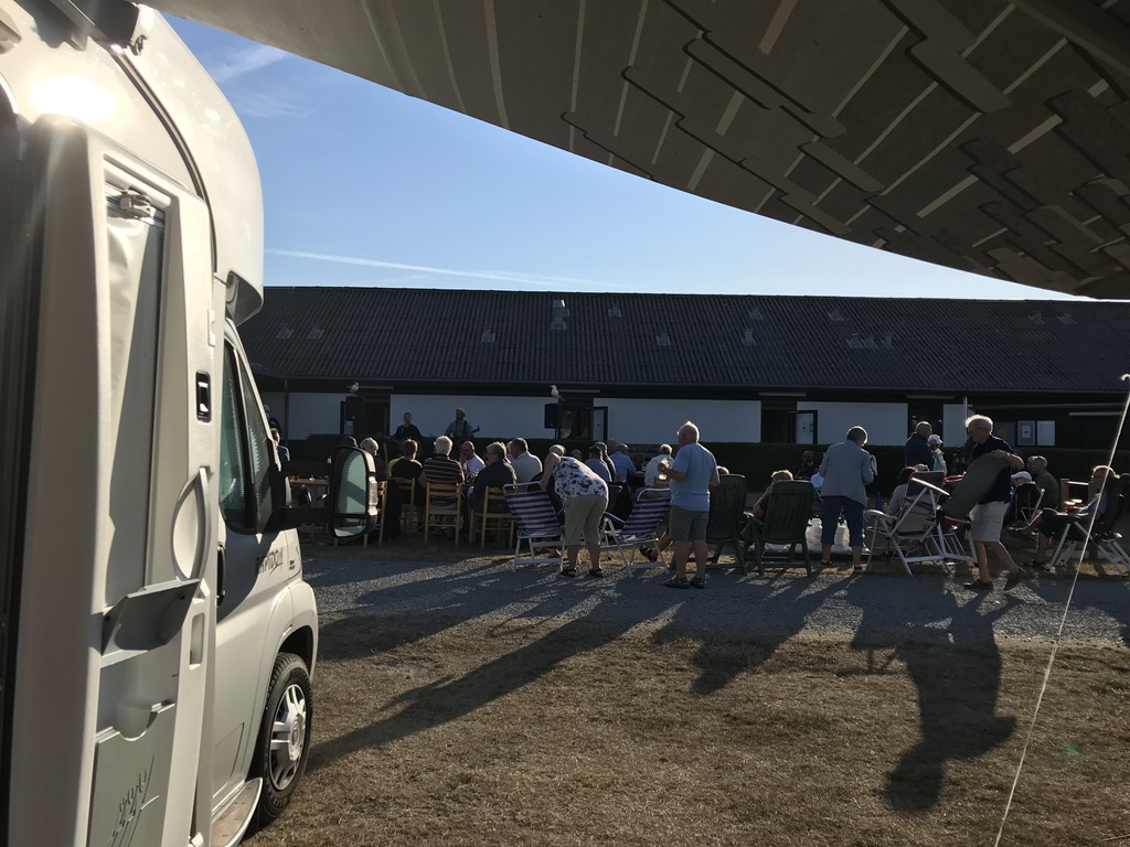 När vi sedan kommer tillbaka till campingen så har de dukat upp för “Pandkageaften” där de steker pannkakor och har levande musik och säljer dricka. Vi fick ju första parkett med husbilen och satte oss utanför och lyssnade.