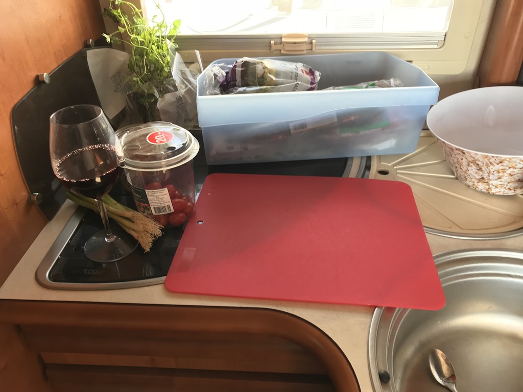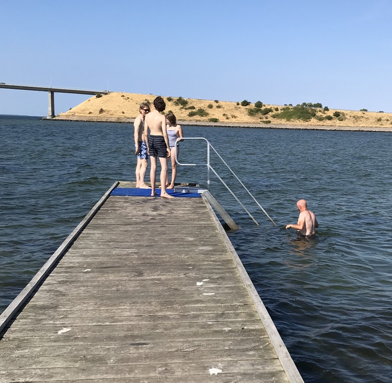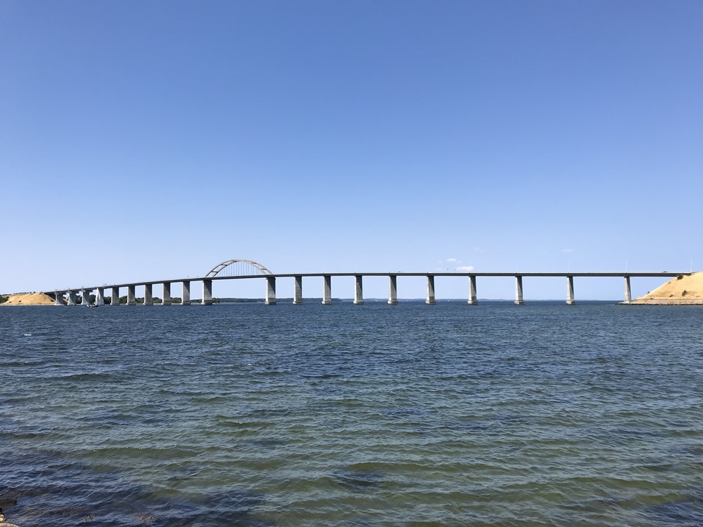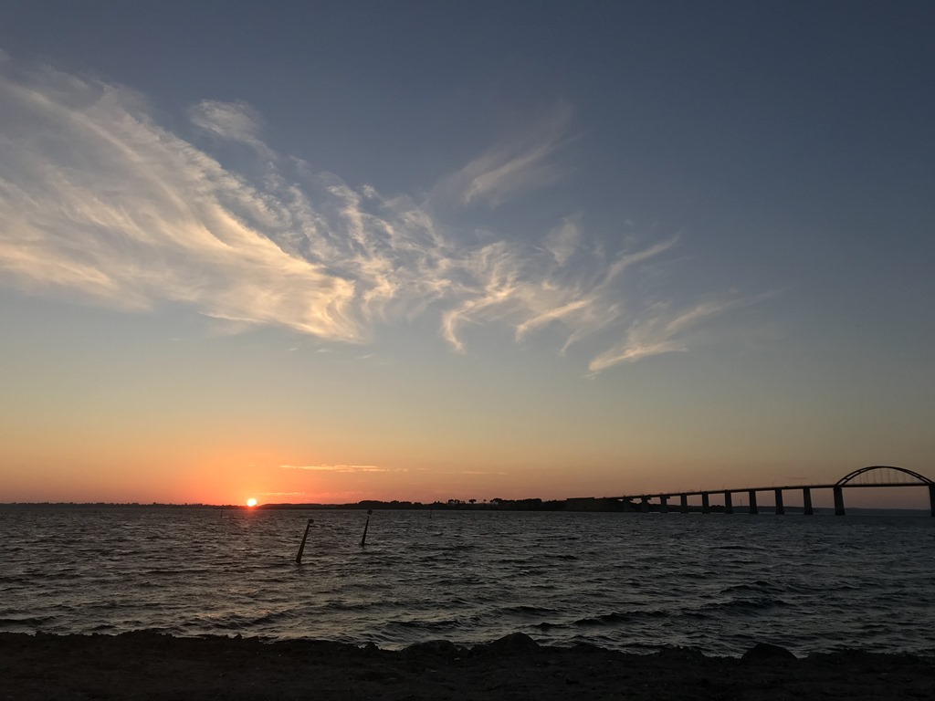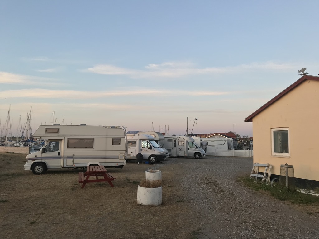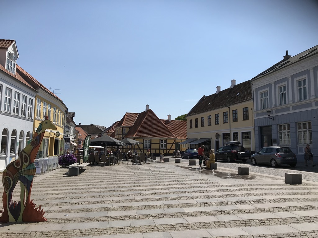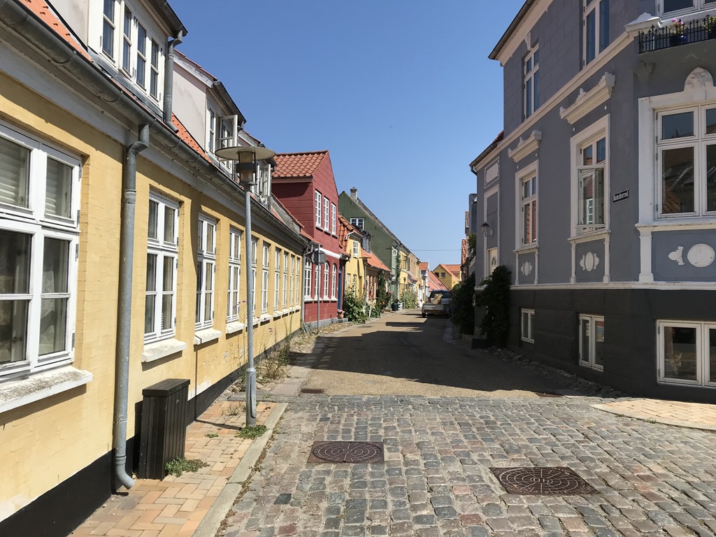 Efter frukost så packade vi ihop och fortsatte över lilla Bält Bron och Österöver på Fyn. Sedan söderut och över till Langeland. Vi hittade en ställplats i Rudköbings hamn som var riktigt fin. Det fanns ett par platser kvar så vi skyndade oss att parkera. Sedan upp mot byn för att hitta lite lunch. Det var en fin gammal by och en hel del små butiker så jag fick köpt mig ett par nya shorts. Vi hittade ett litet Cafe där vi åt fiskburgare.