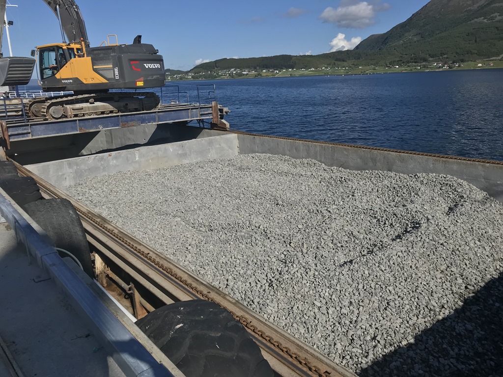 Ja här ligger det 1300 ton så kallat pukk i aktra lastrummet. De håller på att bygga ut väldigt här på Nordlaks så det behövs mycket grus och sten.