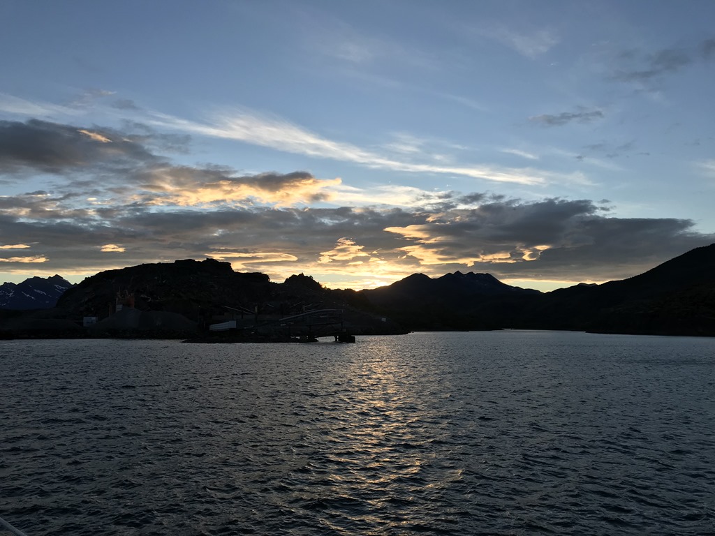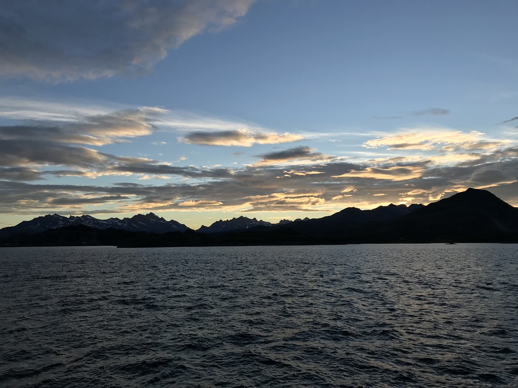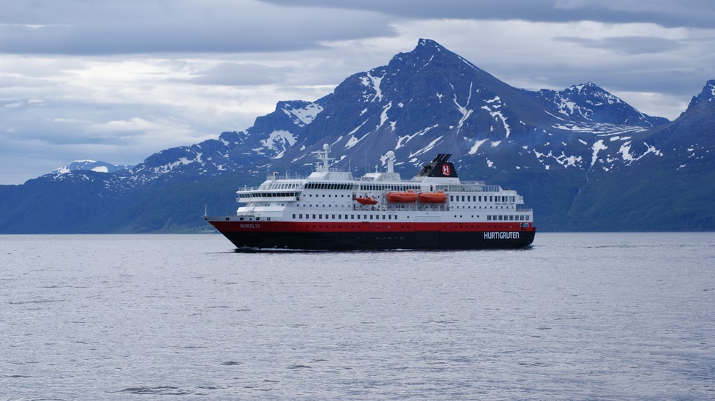 08:00 Kommer på vakt efter en gid natts sömn och vi passerar Harstad. Hurtigruten lämnar samtidigt Harstad och kör snart om oss.