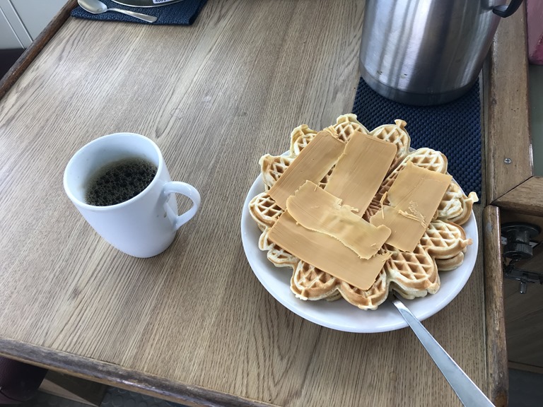 Till 10 kaffet så kommer kocken upp med våfflor. Men han har ju lagt på brunost som alla norrmän älskar, jag även min fru och mina barn gillar det. Men för min del så pillar jag bort osten.