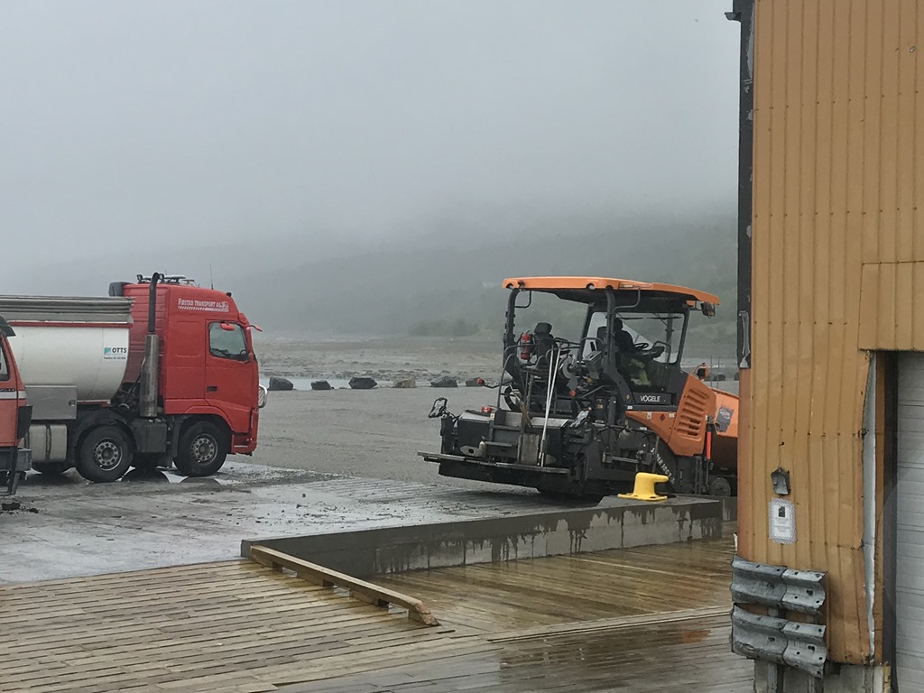 08:00 Kommer på vakt och ser att asfaltsläggarna och lastbilarna har kommit. Men de har problem med att det regnat för mycket så underlaget är för mjukt. Så nu måste de köra med välten för att packa ihop det bättre.