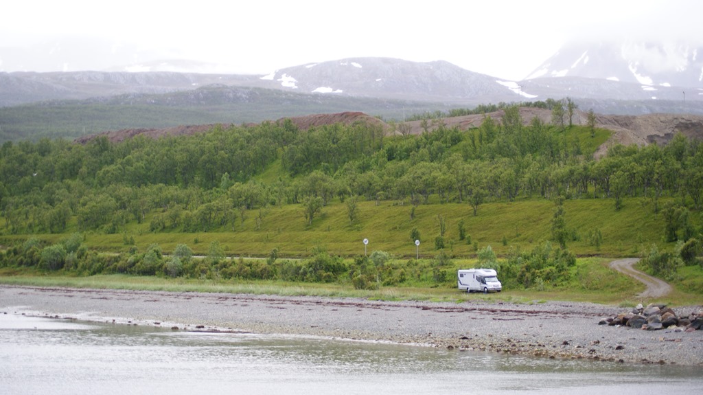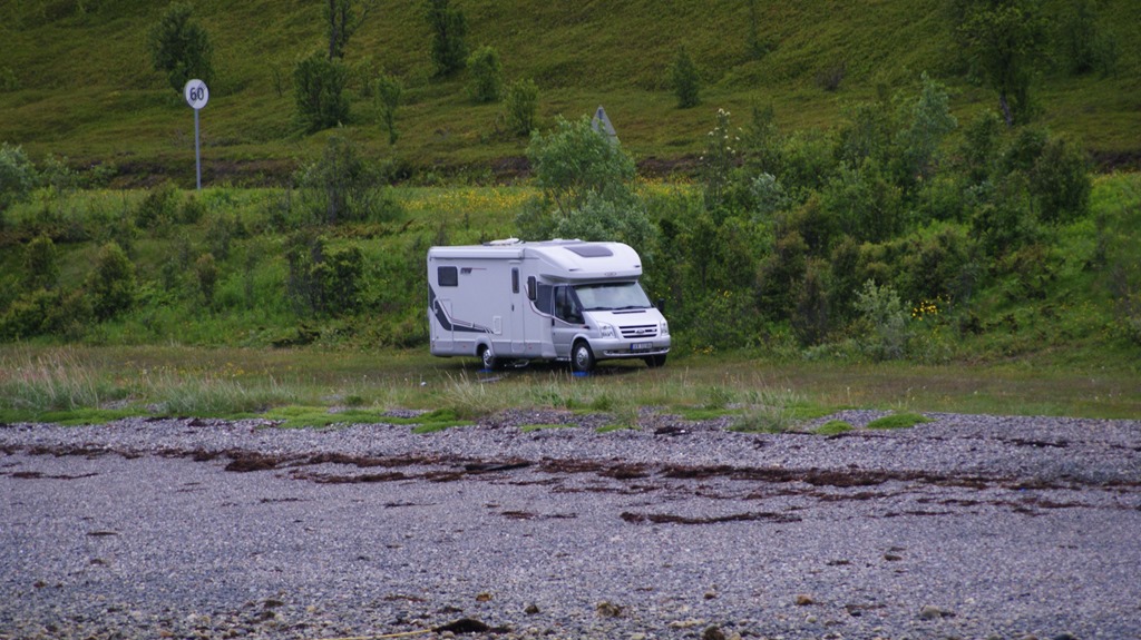 Ser en husbil har stannat till längs stranden här och övernattar.