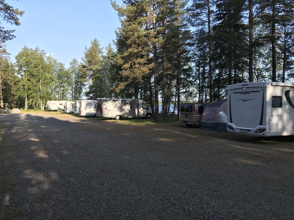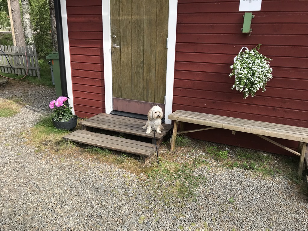 16:10 Framme vid Flåsjöstrands Camping vilket var en mysig liten camping vid sjön Flåsjön. Vi fick en strandplats och grannen skulle precis börja grilla vid eldstaden. Så vi plockade fram vårt kött med. Chilli vaktade rejält på oss och när Britta gick på toaletten så satt hon utanför och vaktade.