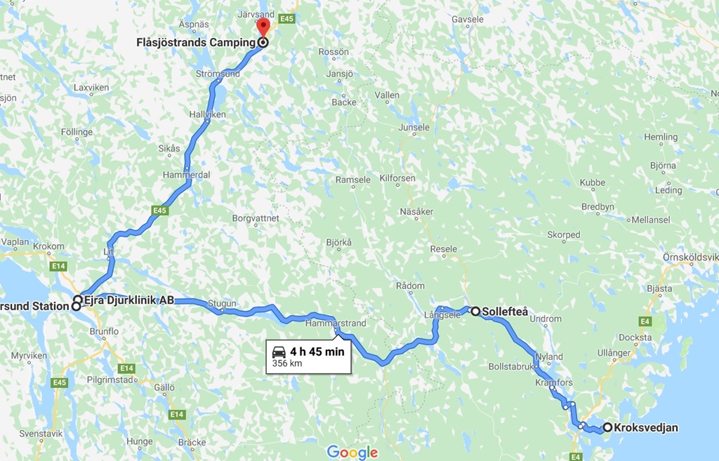 12:20 Framme i Östersund och vi hittade en husbilsparkering inte långt från tågstationen. Vi gick upp på stan för att äta lite lunch. På tillbakavägen så stannade vi på ICA och handlade både åt oss och Linnea. Därefter släppte vi av henne på stationen och vi fortsatte till veterinären. Där fick vi hjälp med att ge Chilli masktabletten och inskrivet i passet så att vi kan åka in till