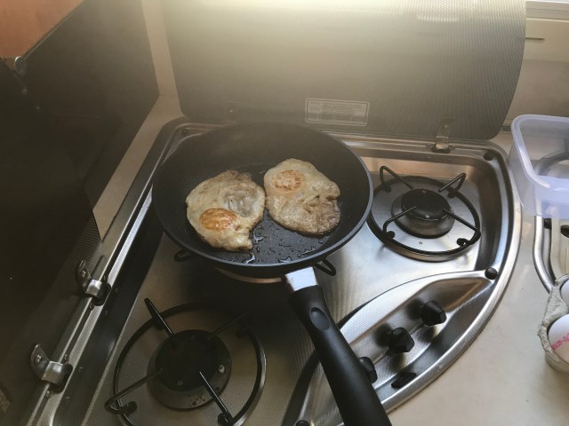 Vaknar strax efter halv sju sätter på kaffet och går en runda med Chilli. Blåser fortfarande lite men är riktigt soligt och fint. Efter frukosten så steker jag några ägg som vi skall ha till lunch.