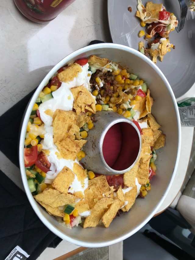 Till kvällen gör jag en tacogratäng i omnian och vi tar lite vin till det.