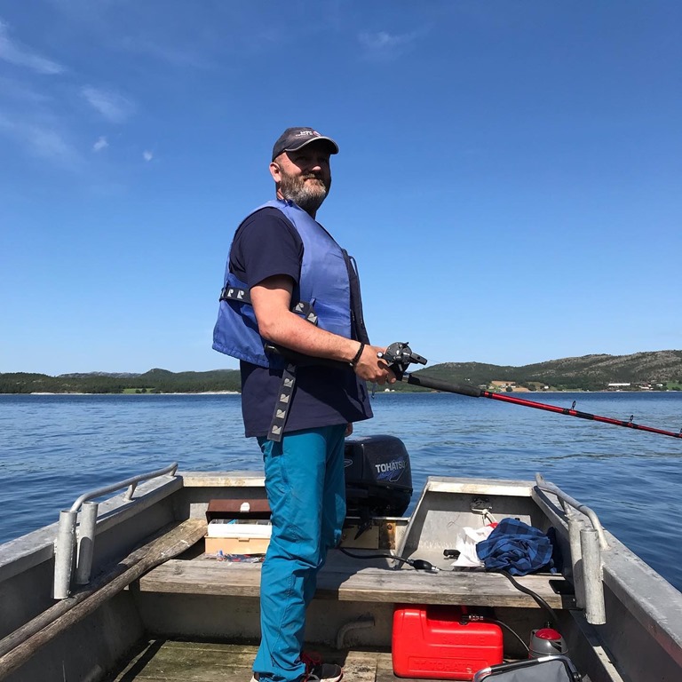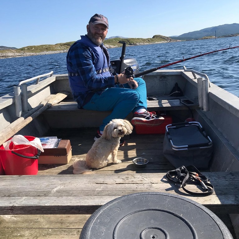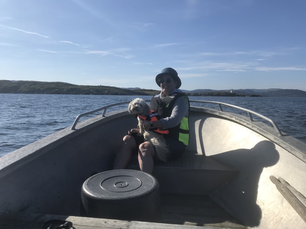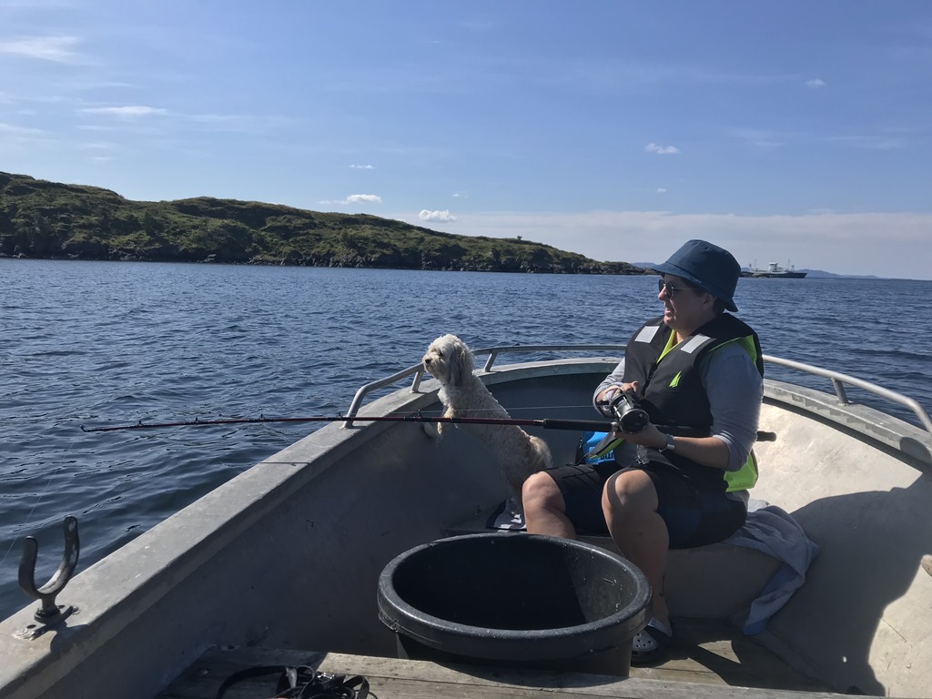 Efter en ganska sen frukost idag så packade vi ihop matsäck, kafffe och fiskegrejor. Vi gick bort till båten och gav oss ut. Det var tyvärr lite mer vind idag men då blev det ju inte så varmt heller. Men Chilli tyckte om att åka båt fast flytvästen var inte så omtyckt.