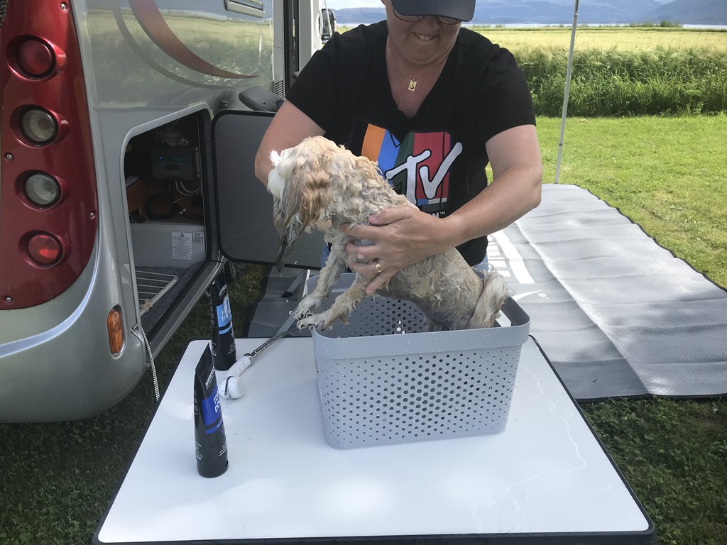 Vi körde ut till en plats som hette Örland Camping det var självbetjäning och antingen betalade man med Vipps som är Norska motsvarigheten till Swish eller med kort på nätet eller kontant i ett brev som stoppades i en låst brevlåda. Sedan var det bara välja en plats och det fanns många att välja. Allt ingick i priset på 300 kronor så vi passade på att tvätta alla våra kläder och även Chilli fick sig en dusch.