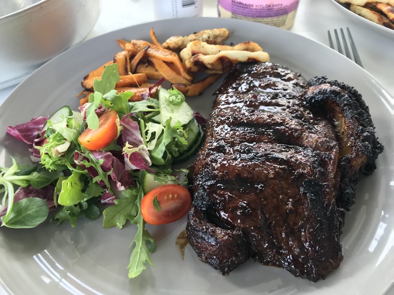 Vi satt ute hela eftermiddagen och till kvällen så grillade jag varsin ryggbiff och gjorde lite sötpotatis pommes i omnian