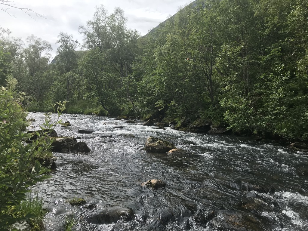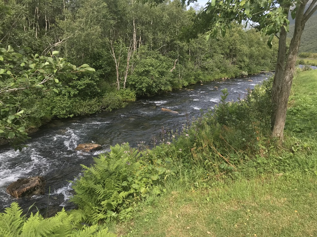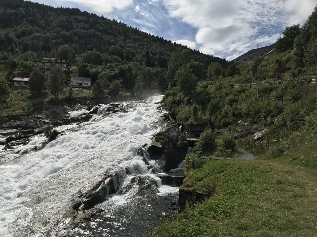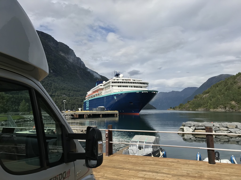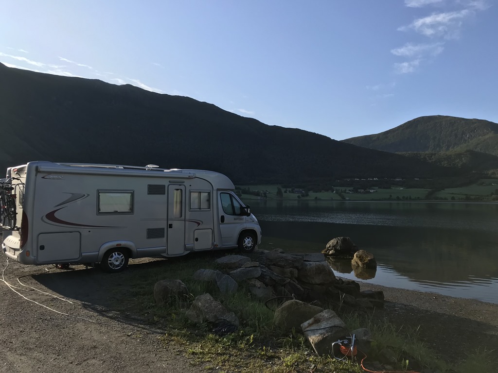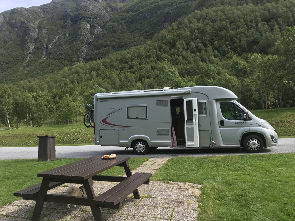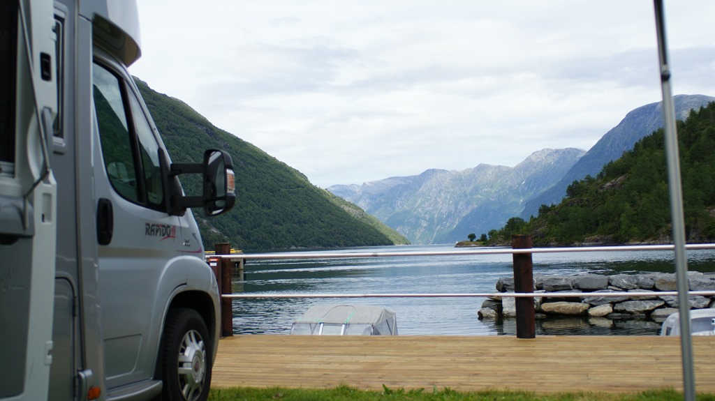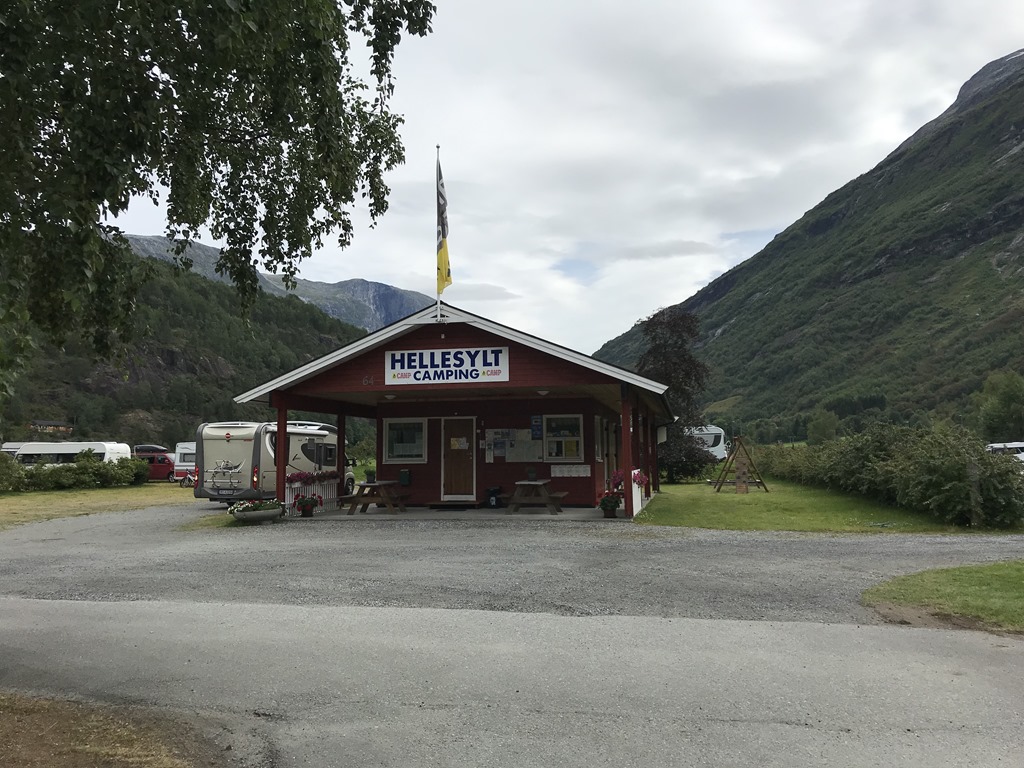 13:30 Framme på Hellesylt Camping och det är nästan helt tomt på campingen så det är bara att välja. Den är inte bemannad innan 19:00 ikväll så vi stannar först för att tömma gråvatten och sedan letar vi upp en fin plats och fyller vatten och kopplar ström.