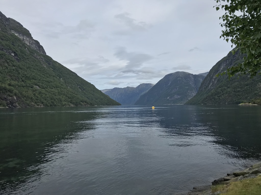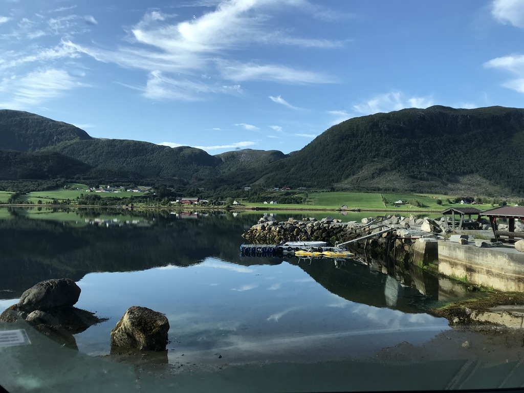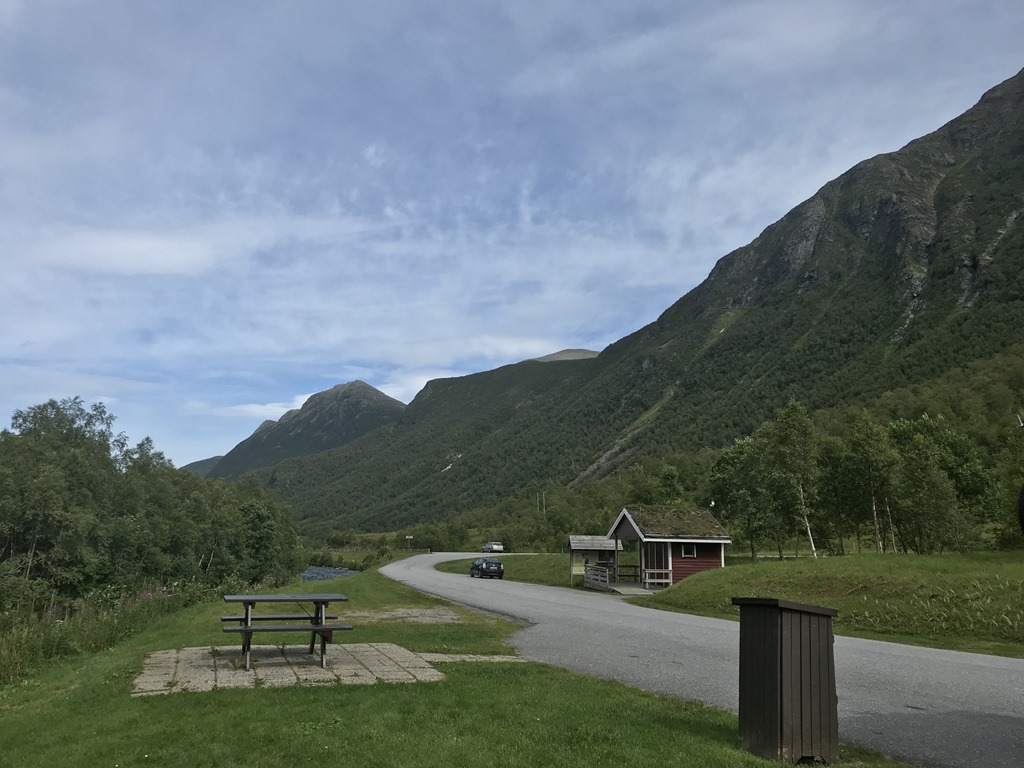 12:20-12:30 Färja från Liabygda till Stranda. Där hade vi tänkt stanna och ta lite lunch men jag hittar ingen parkering så det slutar med att vi kör upp på nästa fjäll. Där hittar vi till slut en jättefin rastplats där vi tar lite kaffe och smörgåsar.