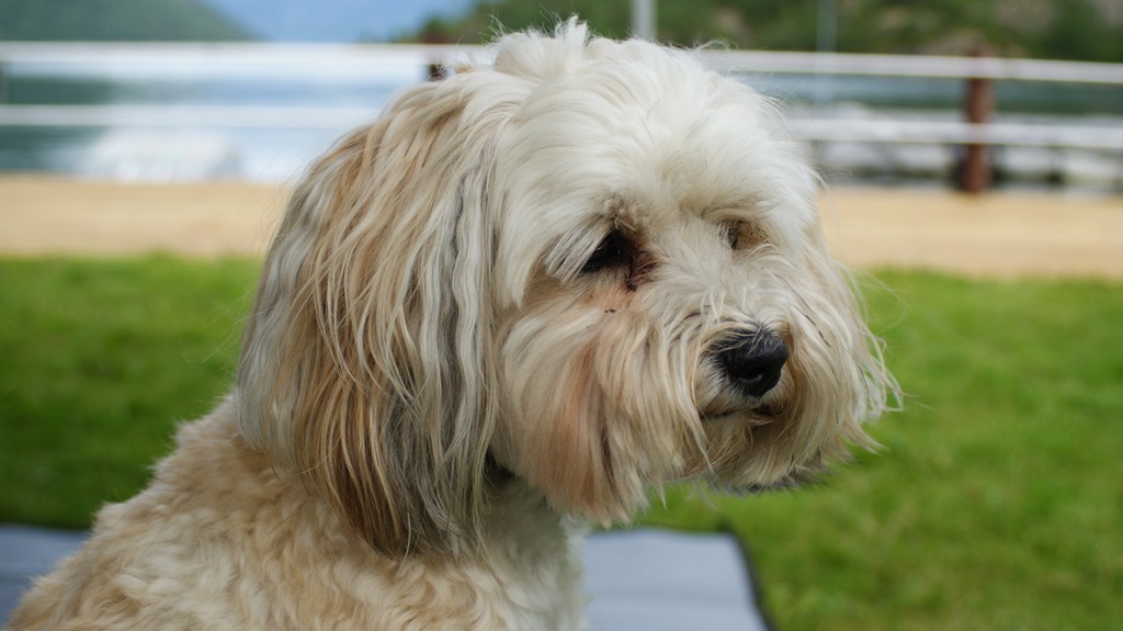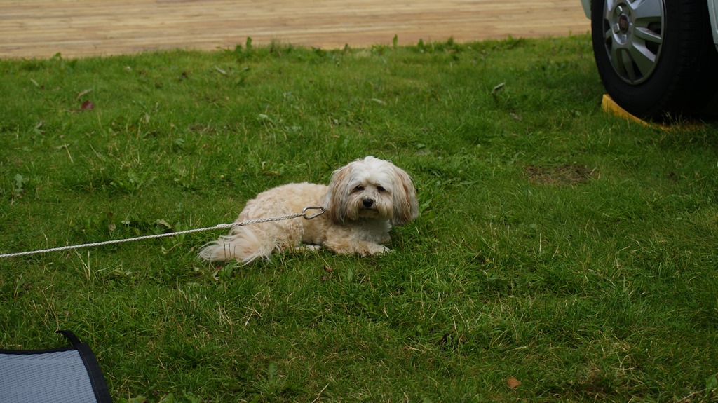 Chilli njuter av att ligga i gräset utanför husbilen.