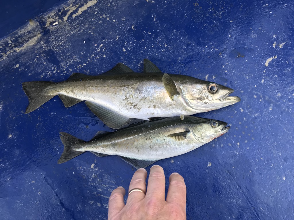 20:00 Kommer på vakt efter en god middag och lite glass. Nu är det riktigt fint väder och jag ställer mig på akterdäck och fiskar lite. Men det blir bara massa småsej som jag slänger tillbaka igen.