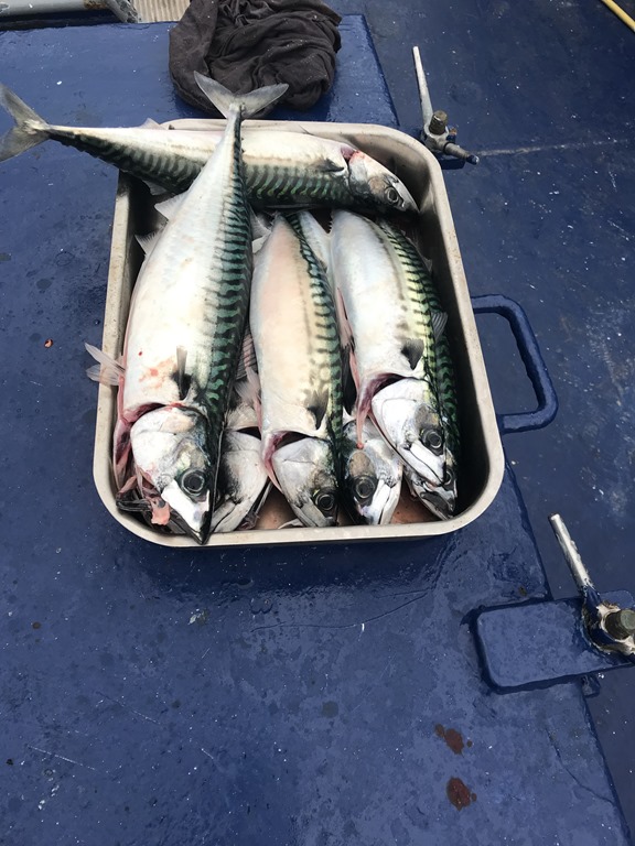 Det blir en hel del makrill och även mycket småsej som jag slänger i. Vi har nu fått såpass att jag slutar fiska och kocken rensar all makrill och fryser in en del.