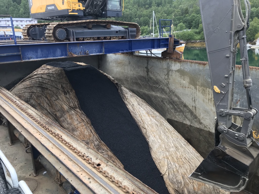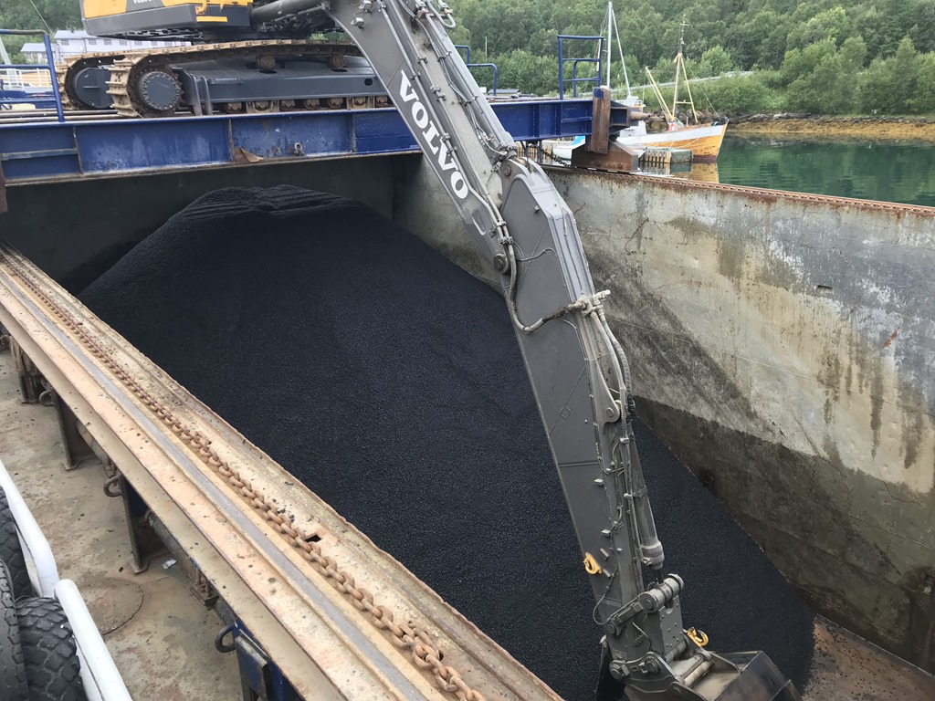 Besättningen börjar ta av mattan från asfalten så vi kan börja lossa 780 ton asfalt.
