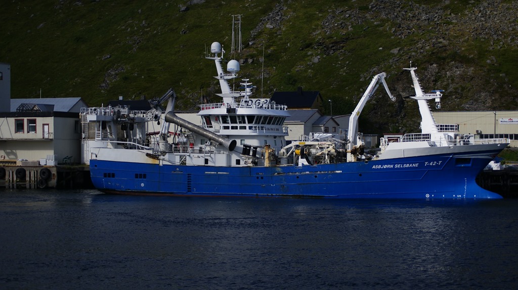 13:40 Färdig lossade och avgår, på vägen ut så passerar vi en krabbfiske båt som har brunnit och en stor ringnotsbåt.
