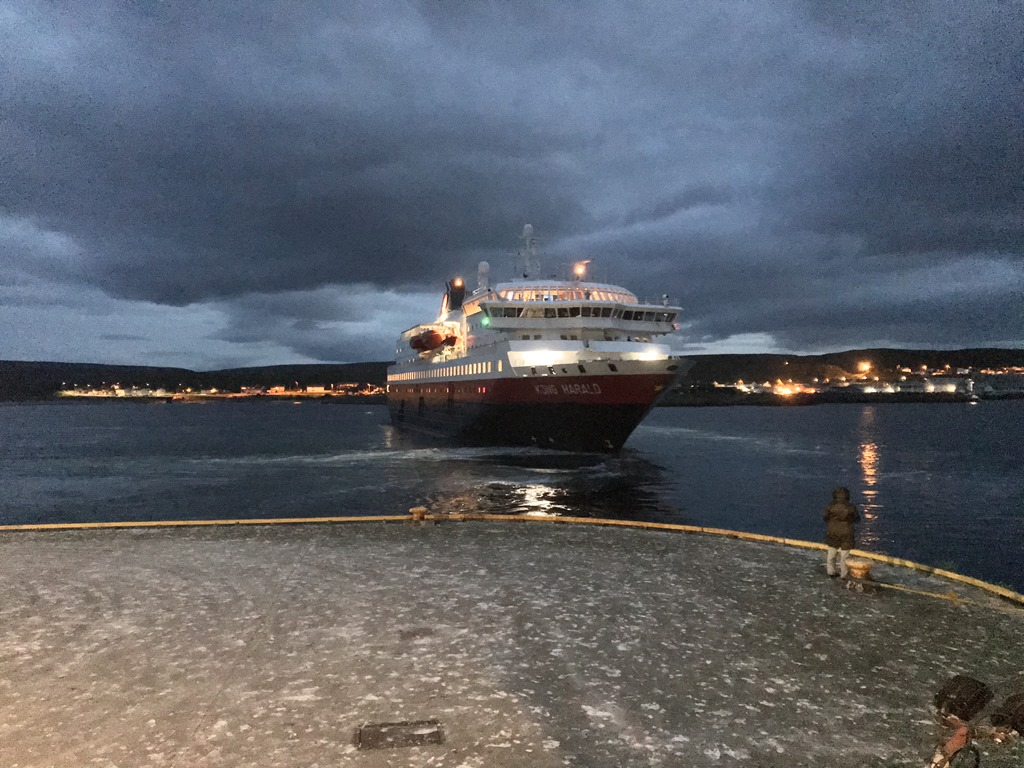 21:30 Stoppar lossningen eftersom Hurtigruten skall komma till kaj här. Först kommer Kong Harald från Öster och direkt efter så kommer Vesterålen Västerifrån.