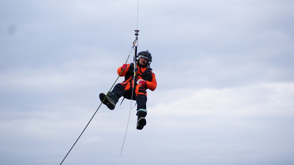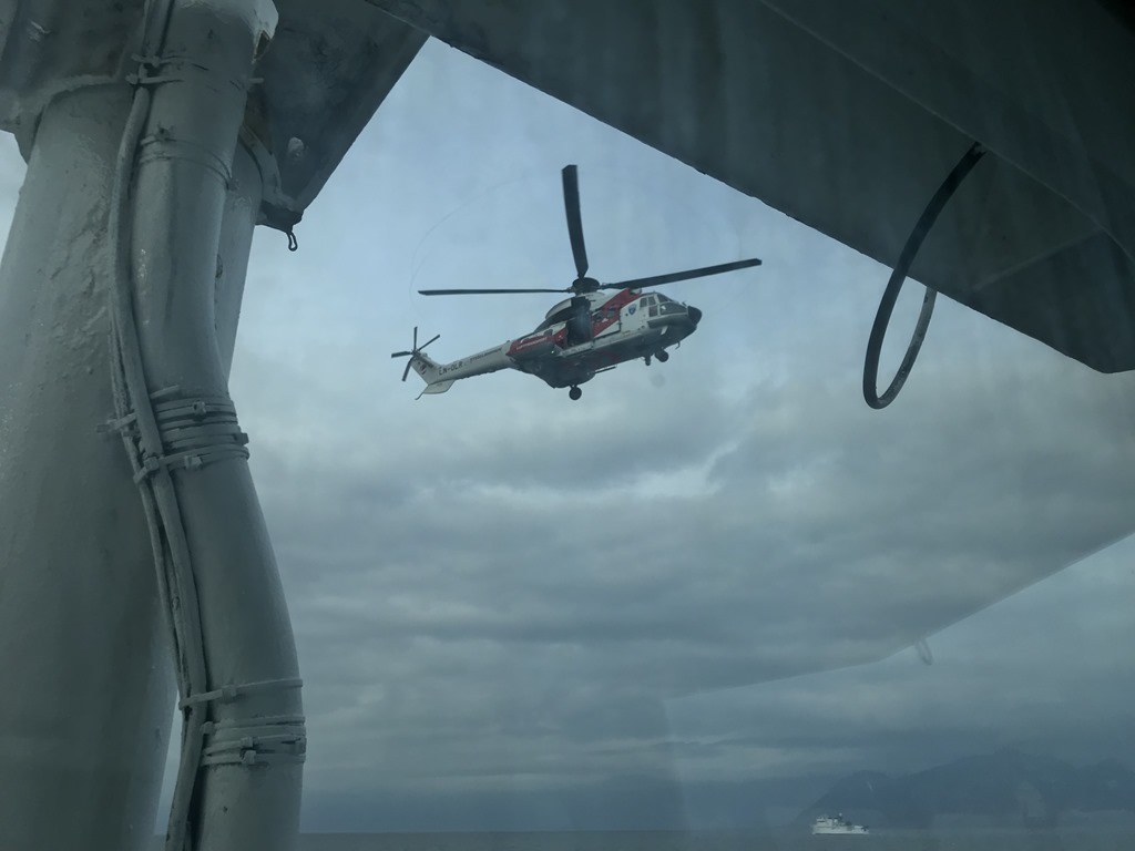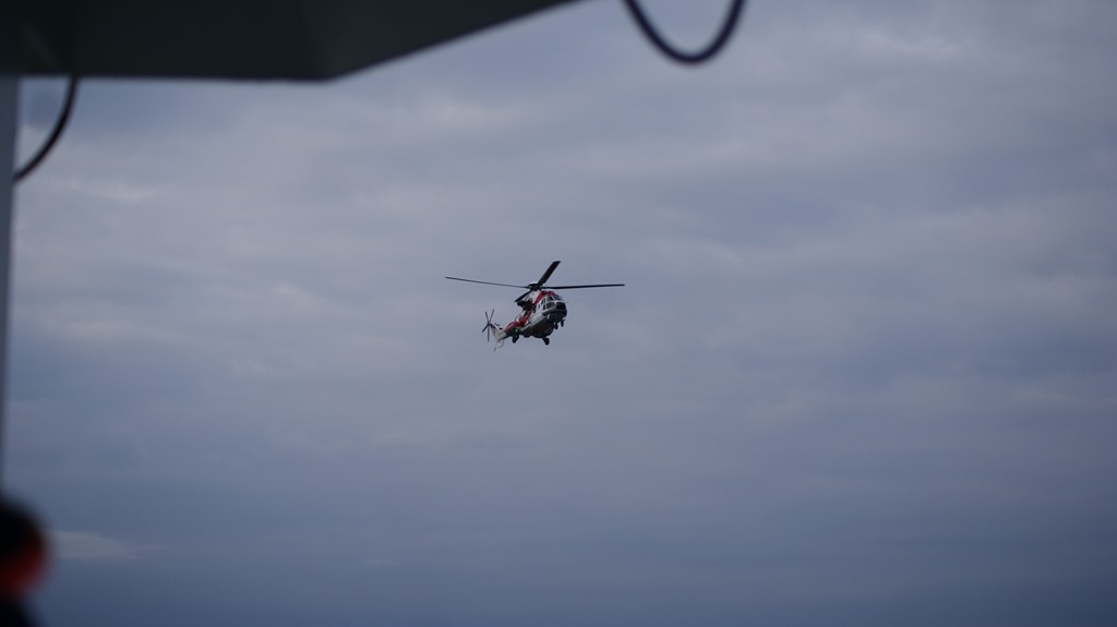Så under en halvtimmas tid så håller de på att öva upphissning från båt i fart. De tackar så hemskt mycket för assistansen. Men det är ju bara skoj att få vara med och öva så vi vet hur det går till den dagen som vi behöver evakuera med helikopter.
