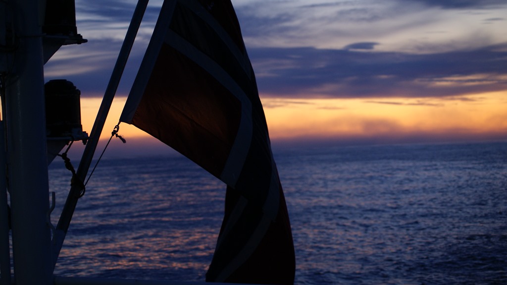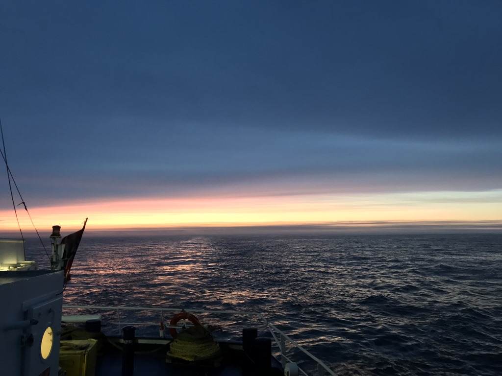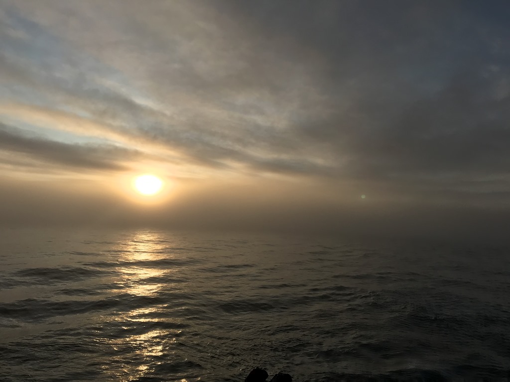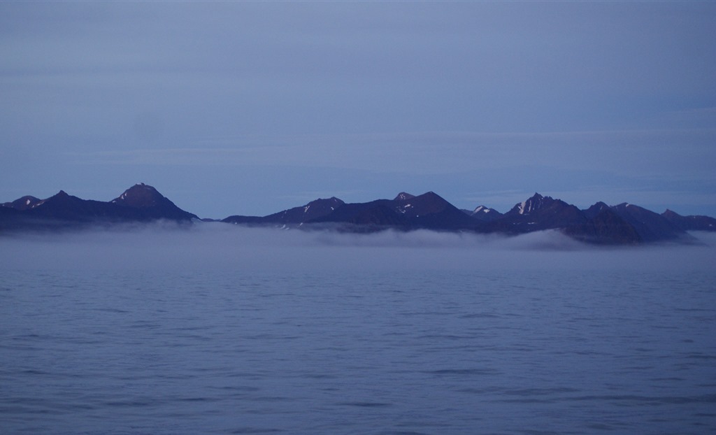 08:00 Kommer på vakt när vi passerat Sörkapp och har 12 timmar kvar till Björnöya. Dimman har lättat men det är ingen vind och bara svag dyning.