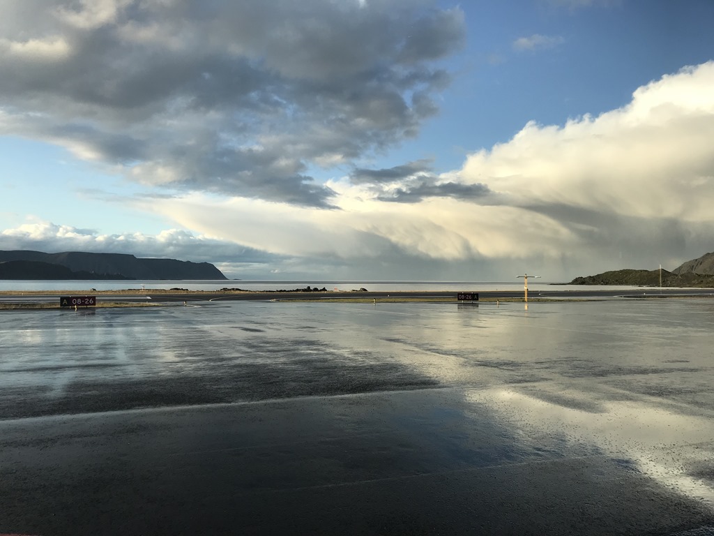 17:15 Tar taxi ut till flygplatsen och det är bara 1 person som sitter där och väntar. Det finns ju ingen kafeteria eller kiosk på flygplatsen men utsikten var ju fin bort över Nordkapp platån.