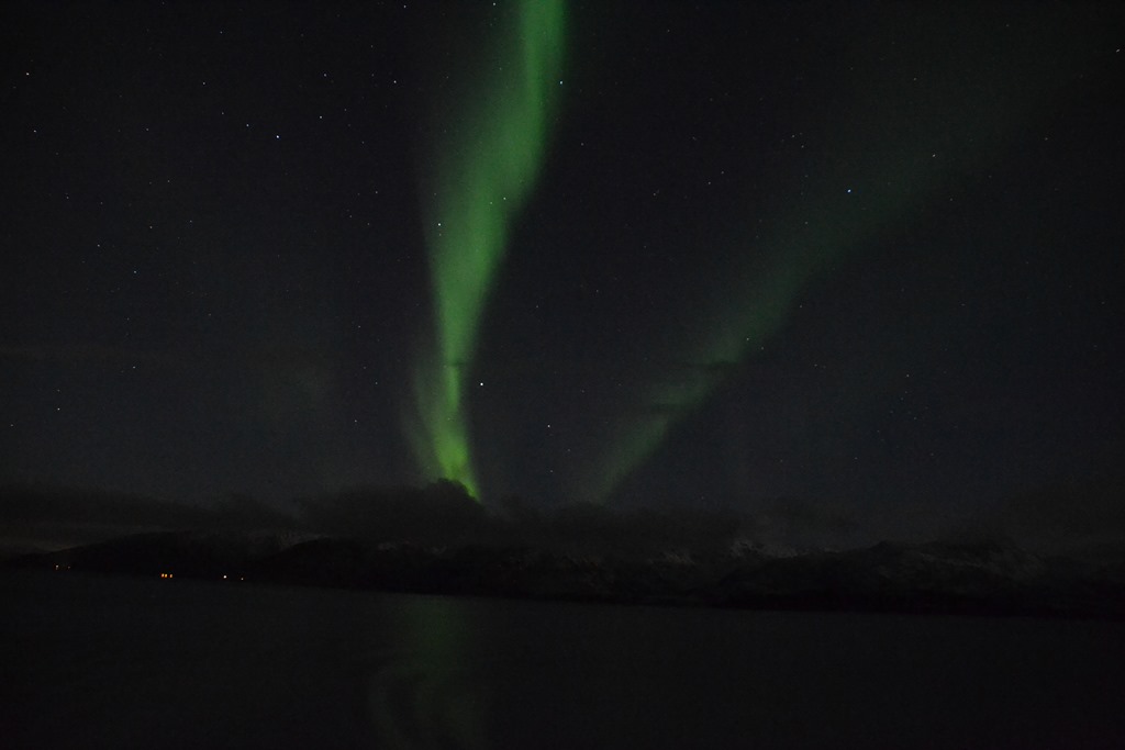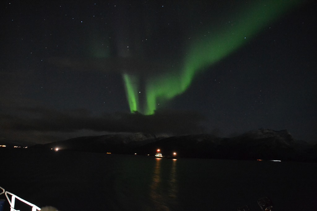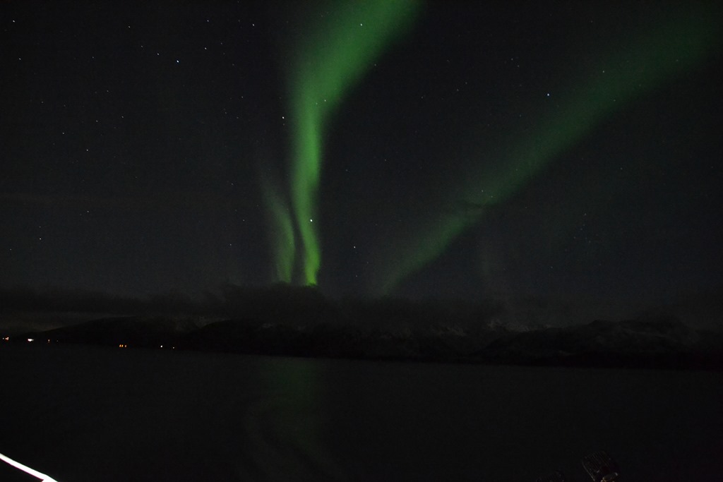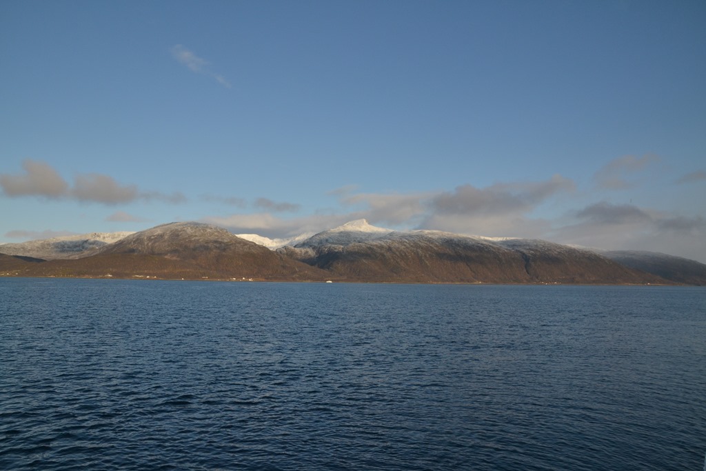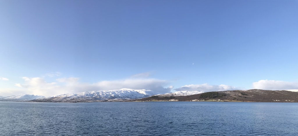Vid 12 tiden så är vi framme utanför Tromsö men vi kan inte gå till kaj innan vid 14 tiden. Så vi ligger stop och driver på fjorden.