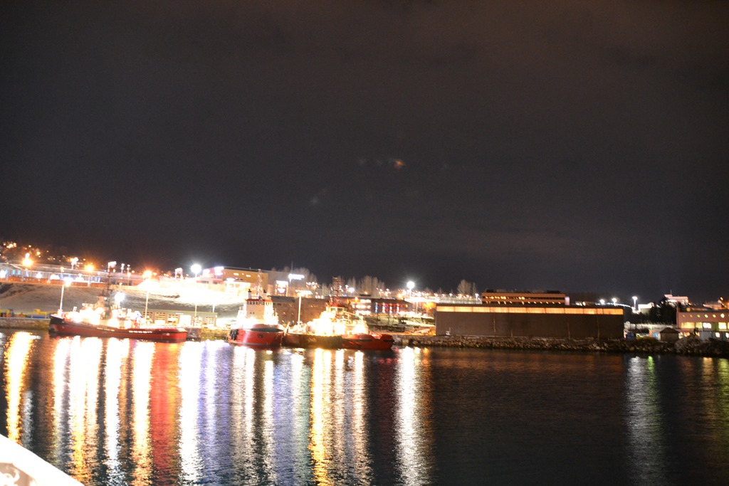 21:05 Förtöjda i Narvik och börjar genast lossa. Men det har redan mulnat på så det blir inga norrskenskort i kväll.