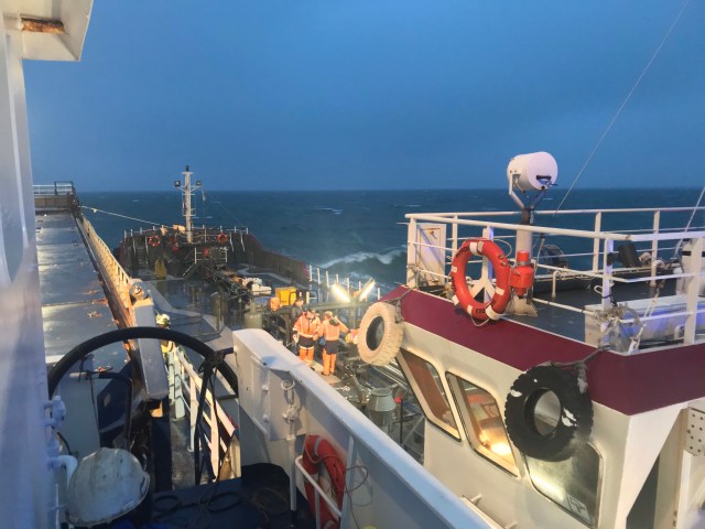 08:00 Kommer på vakt och ser att bunkerbåten är på väg. Pratar med dem och de skall komma på sidan av oss för att se om det går att bunkra idag. Det blåser 14-19 m/s sydvästlig vind.