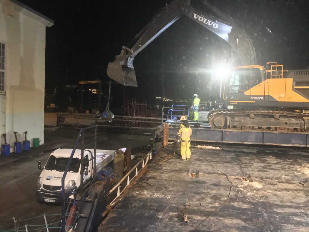 07:00 Reparatörerna kommer och börjar installera styrhjulen. Men sedan tar det tid. De nya stora hjulen måste ju få svarvat hål för axeln på winchen och det tar tid.