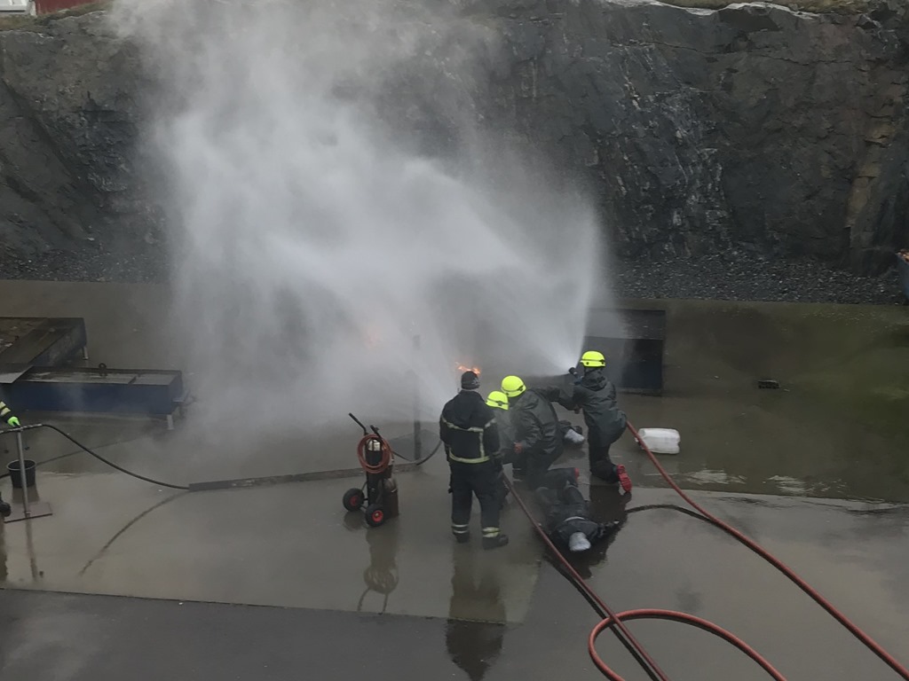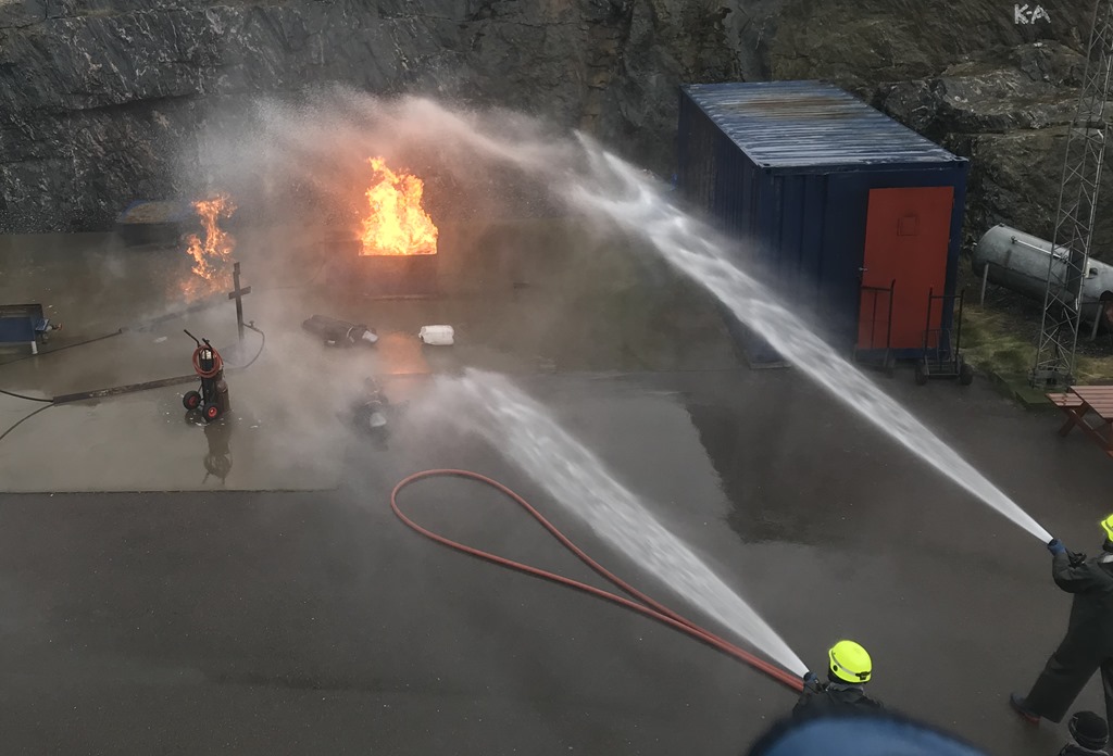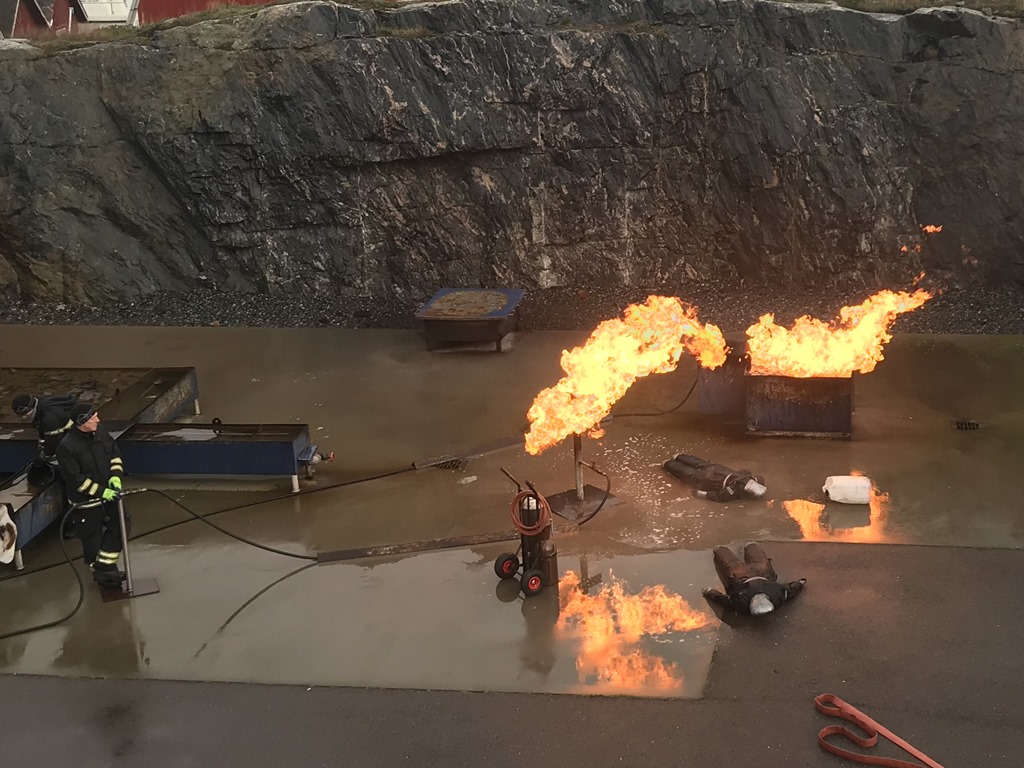 Här går vi fram vid en gasolbrand och stänger av ventilen i skydd av skyddsstråle från 2 munstycke.