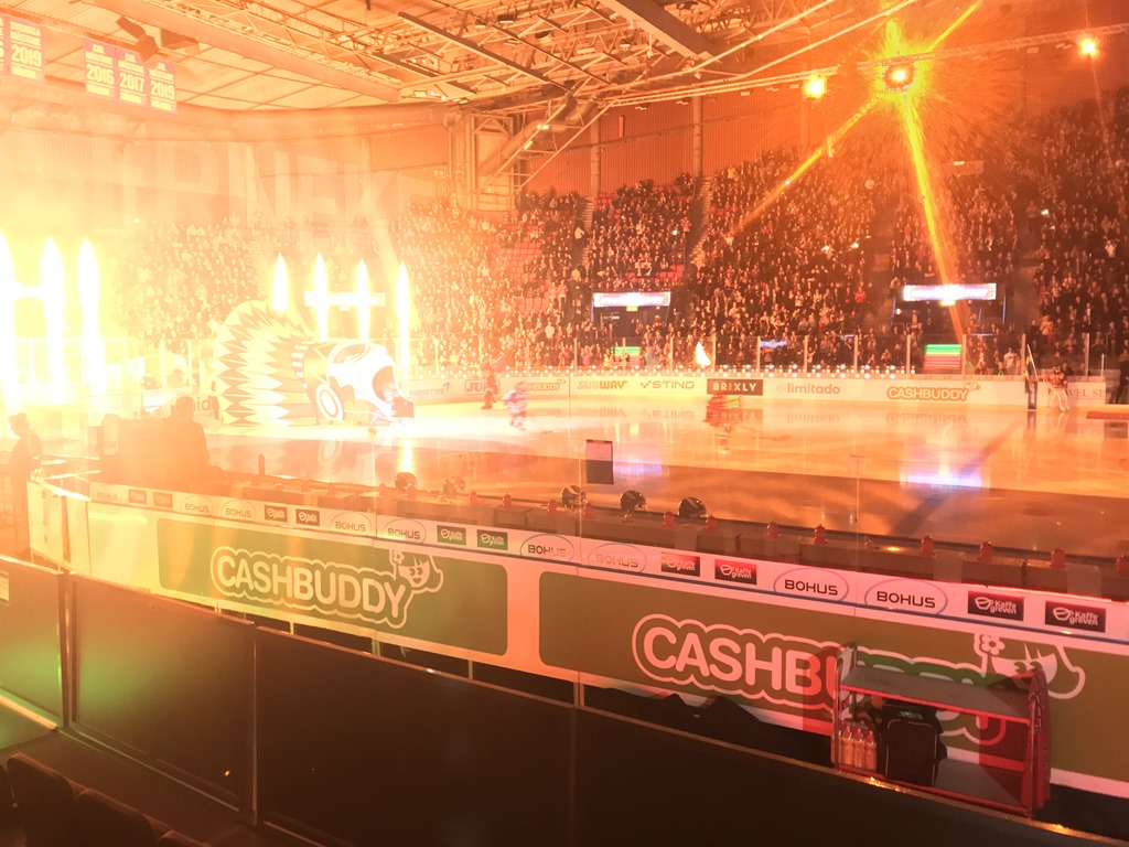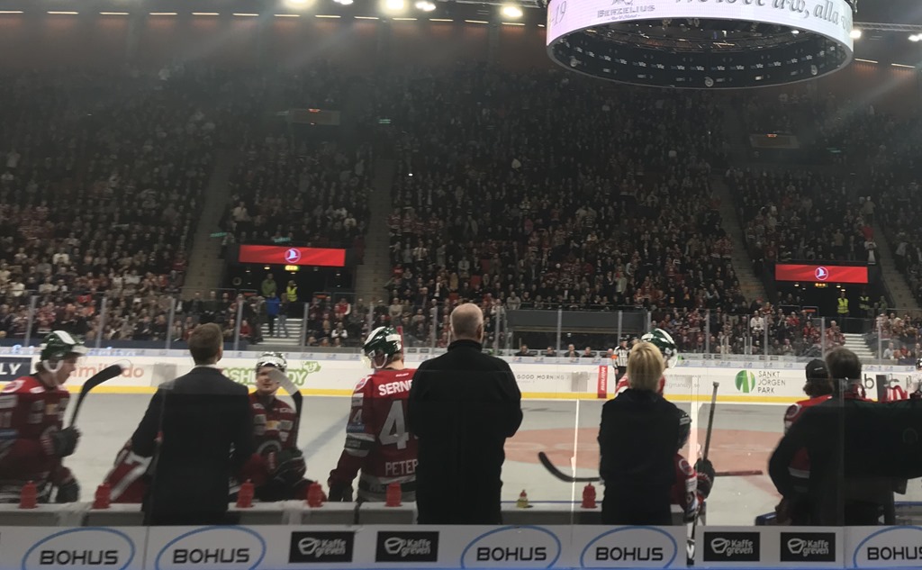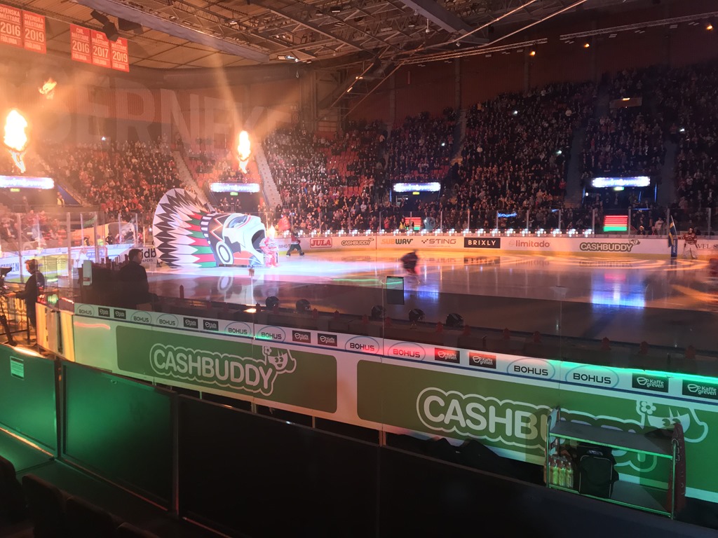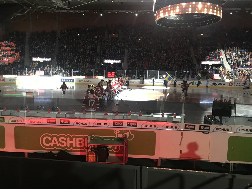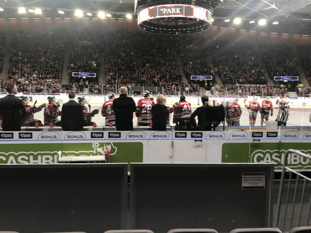 18:45 Kommer in på Scandinavium och letar upp våra platser. Det blev tydligen precis bakom Frölunda båset och nästan nere vid isen.