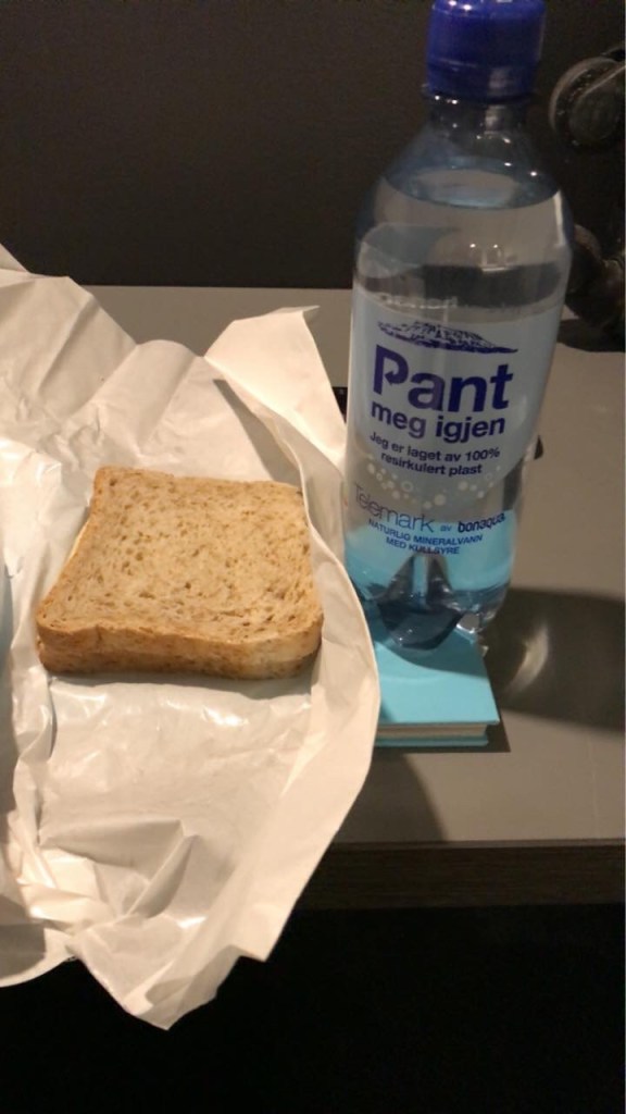 19:13-19:36 Tåg in till Oslo centralstation. Där går jag till hotellet och checkar in. Åker upp och lämnar min väska och ringer hem. Sedan går jag ner i receptionen för att höra om det finns något att äta och dricka. Han säger att alla restauranger är stängda och det är förbjudet att servera alkohol. Så det blir att köpa sig en smörgås och en flaska vatten.