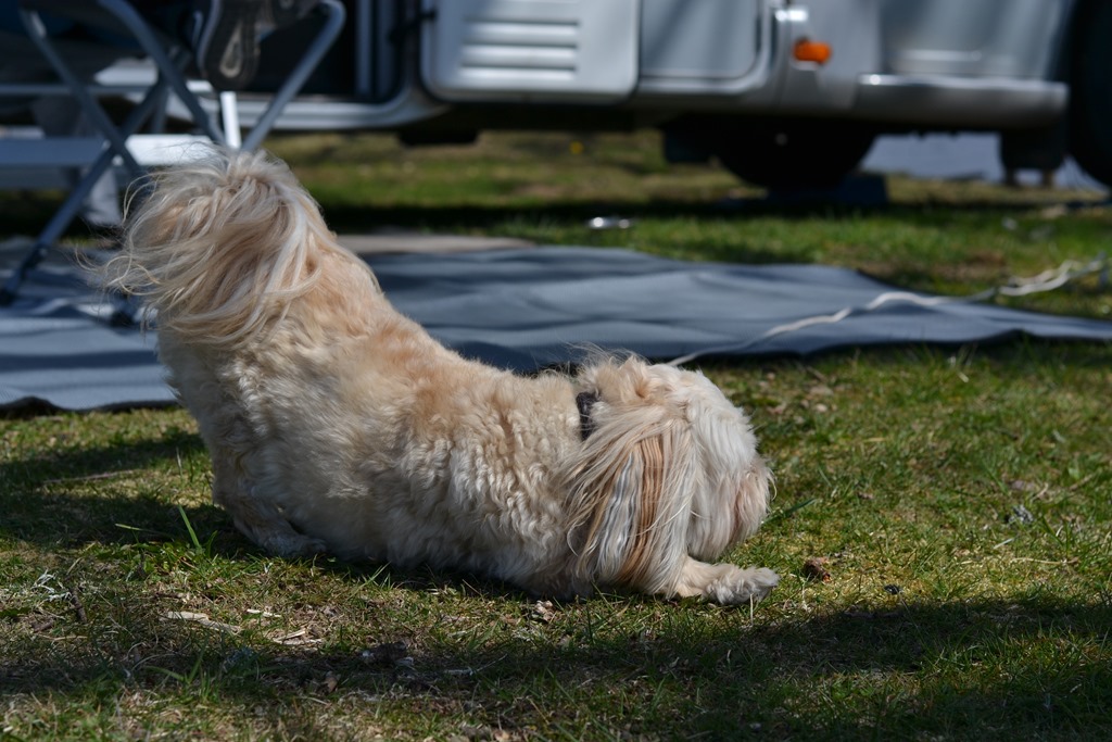 Vi har varit helt ensamma på ställplatsen ända till klockan 21 på kvällen då det kom en bil och parkerade för natten.