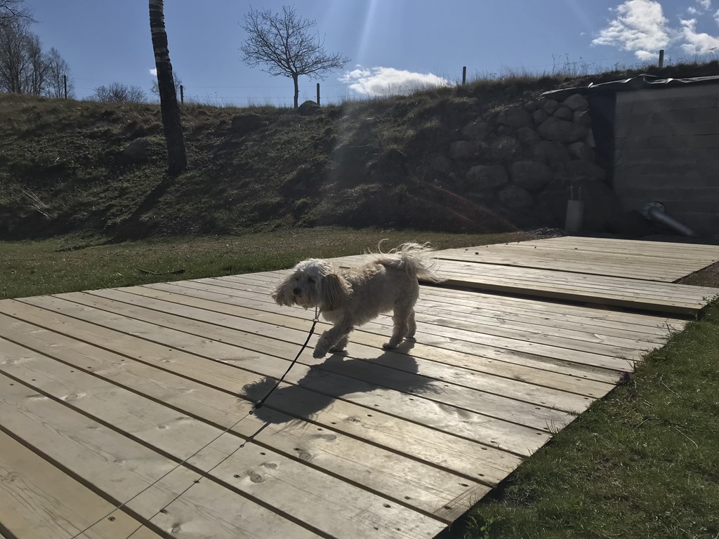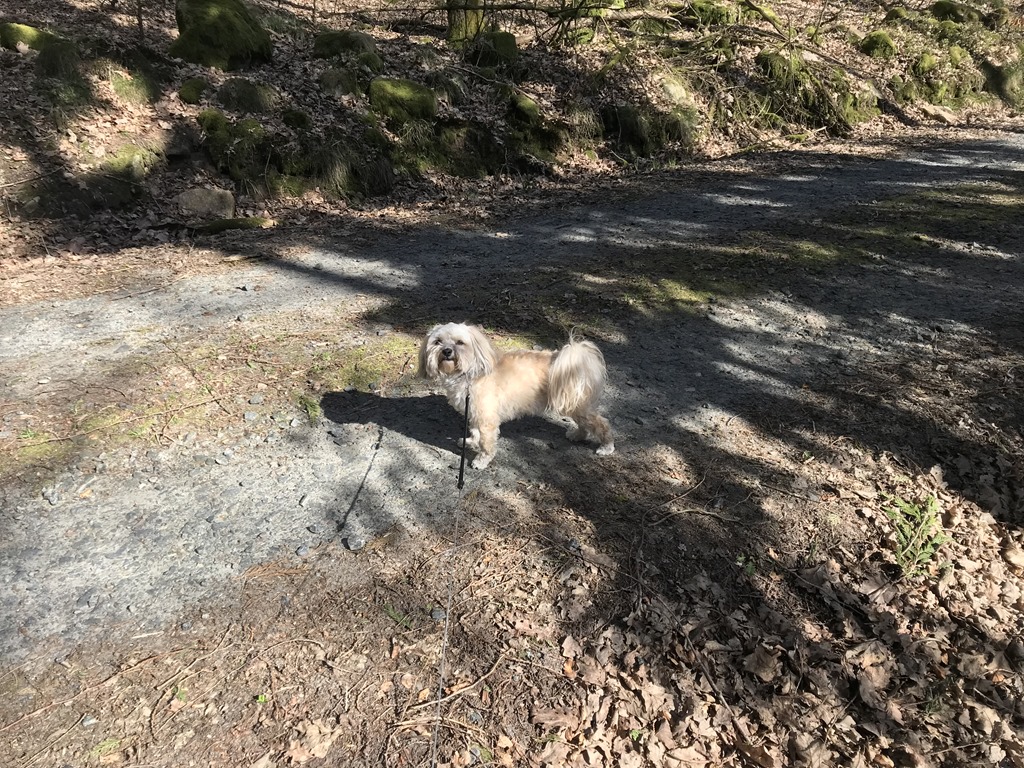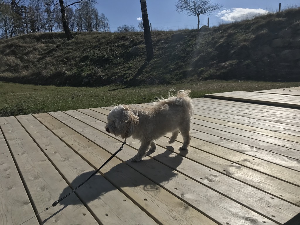 När Britta vaknat så åt vi lite frukost innan jag tog på mig och tog med Chilli på en utflyktstur. Samtidigt så gav sig husbilen iväg så nu är vi ensamma igen. Tänkte se om det går att hitta en lite närmare väg till Hiaklitten så man slipper gå längs den den trafikerade vägen. Jag hittade en fin genväg som gick genom en fin skog och över en äng.