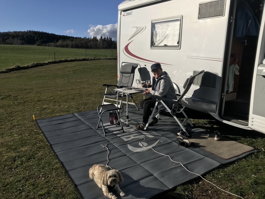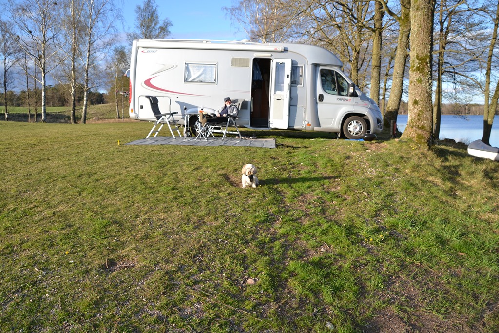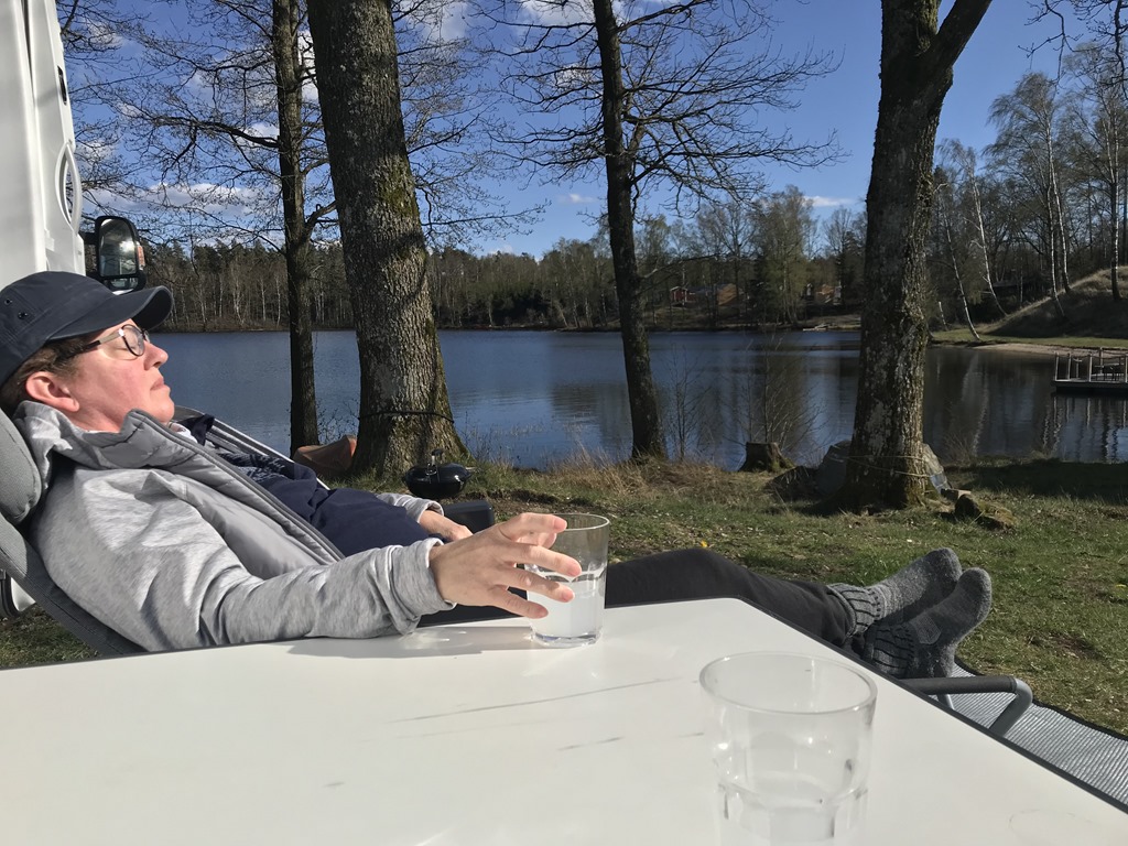 Det blev en helt underbar eftermiddag här och vi satt ute och åt. Nu under eftermiddagen så dök det upp en husvagn som ställde sig här.