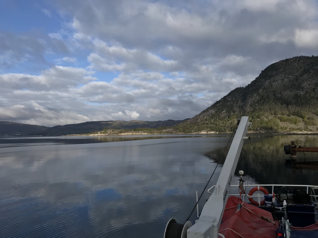 08:00 Kommer på vakt och lossningen är i full fart. Lite skiftande väder med mulet inåt i fjorden men fint utöver.