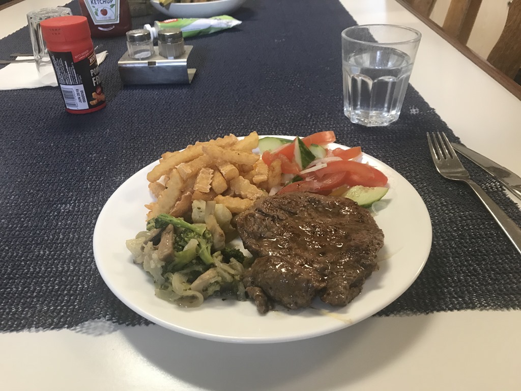 Jag går av vakten och bjuds på veckans Oxfile med pommes och sallad. Blev en skål med glass till dessert. Sedan rätt i säng, märks att man börjar på femte veckan nu för man blir tröttare efter varje vakt. Är ju 12 timmars arbete alla dagar.