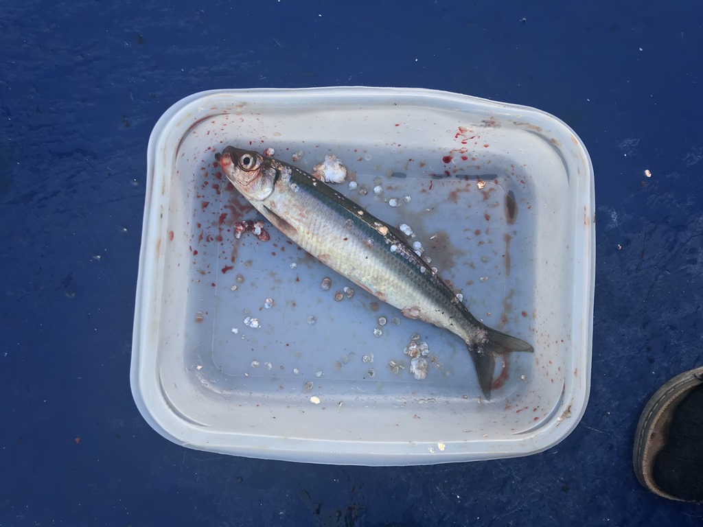 20:25 Förtöjda vid kaj och det blir ingen lossning innan i morgon bitti. Manskapet provar fiskelyckan och de får upp en stor sill.