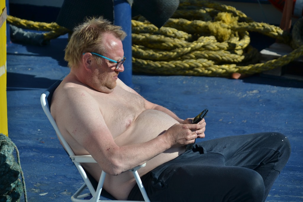 17:00 Vaknar och går upp på däck lite i solskenet. Tycker det luktar stekt bacon och när ag kommer upp så blir jag bländad av Johnny. ![]()