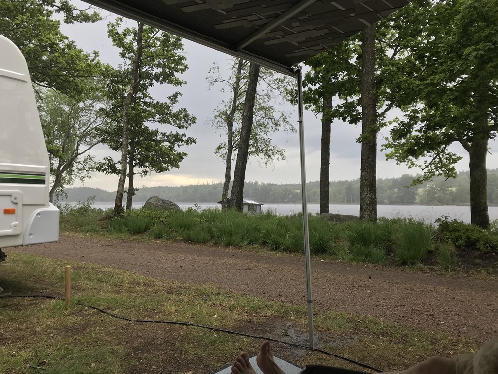 Och lagom till kaffet så kom det obligatoriska midsommarvädret med regn och åska. Så vi satt här nere och hörde hur spelmännen spelade uppe vid servicehuset. Vi hade ingen lust att gå dit upp när det regnade så vi satt här nere och njöt av jordgubbar med grädde.
