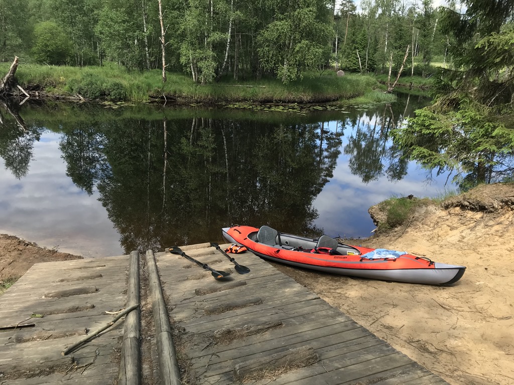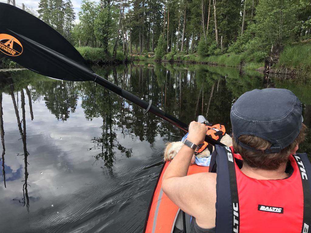 Vi gjorde en matsäck och gav oss iväg med kajaken upp i Lillån. Chili satt längst fram och spanade medan vi sakta paddlade nerför Lillån.