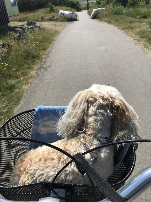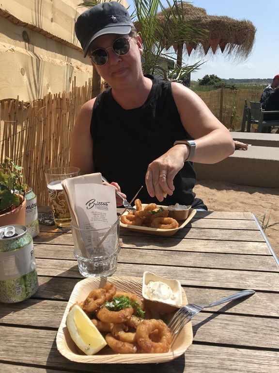 Vid lunch så cyklar vi bort till stället med det passande namnet Brittas Strandveranda. Mycket trevligt ställe med trevlig personal och även Chili var välkommen in och hon fick sig en vattenskål medan vi tog Calamares.