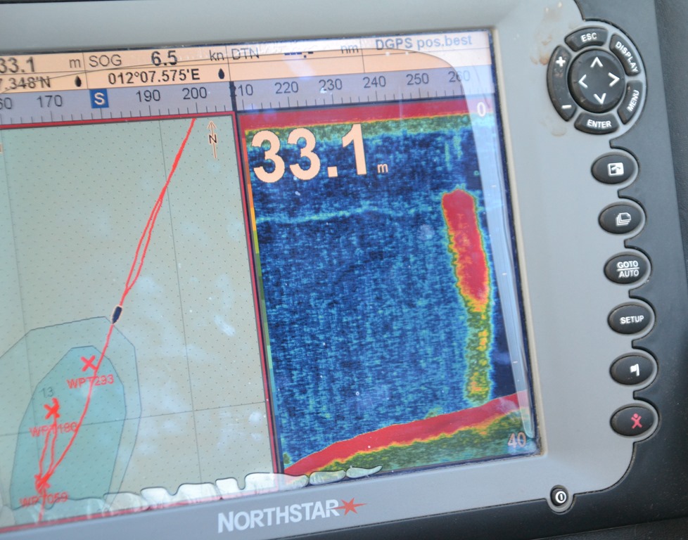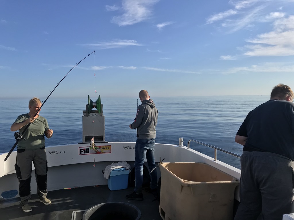 Vi får se en ordentlig sillfläck på ekolodet så vi stannar till för att se om där finns någon makrill.
