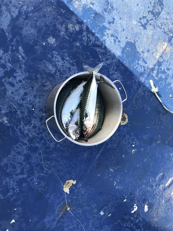 Jag ställer mig och fiskar lite och får ett par makrillar och då kommer hela besättningen upp och vill vara med. Så nu blir det makrill till kvällsmat.