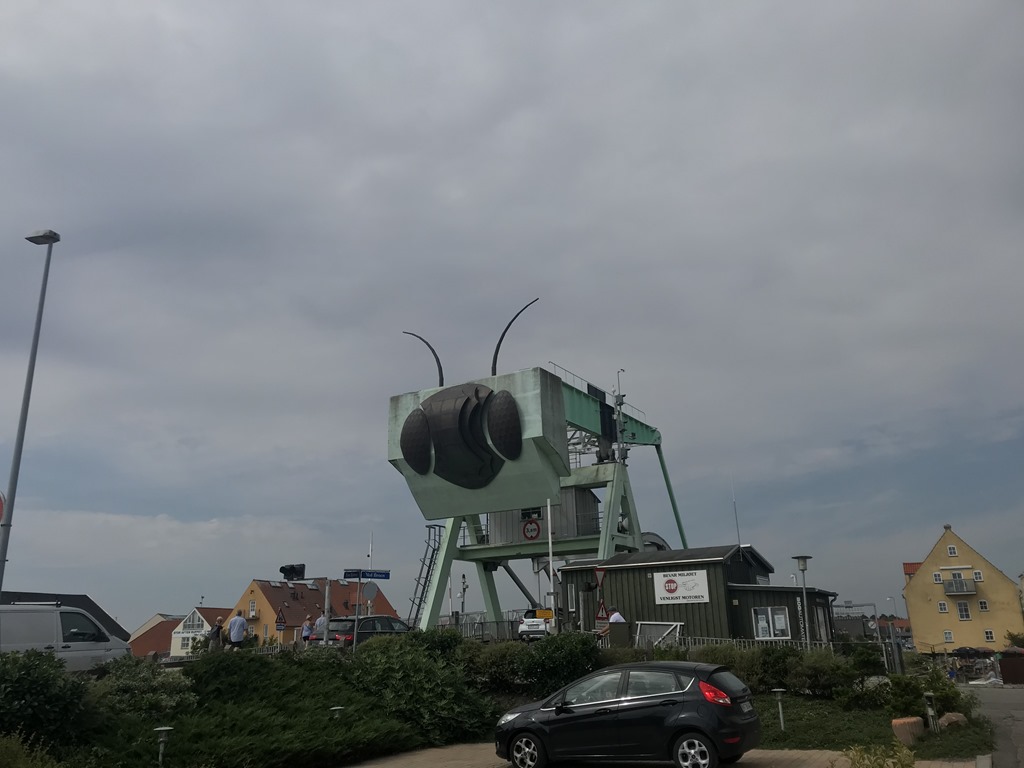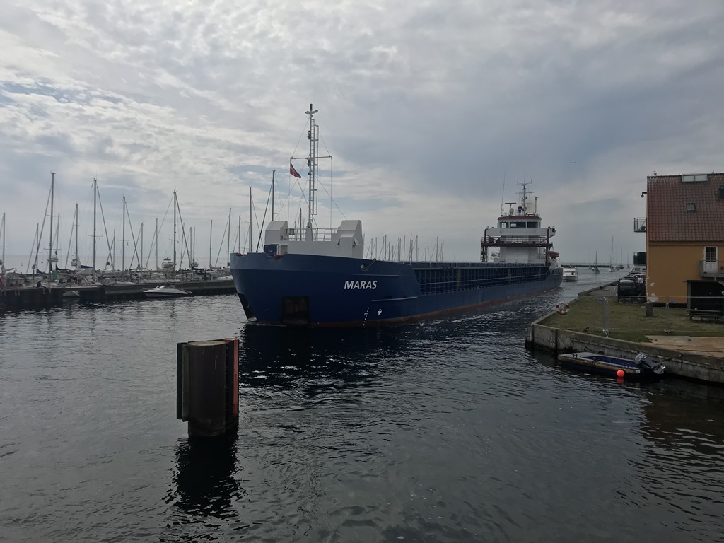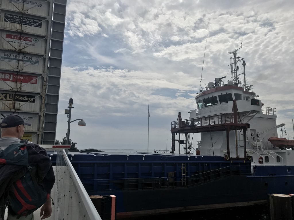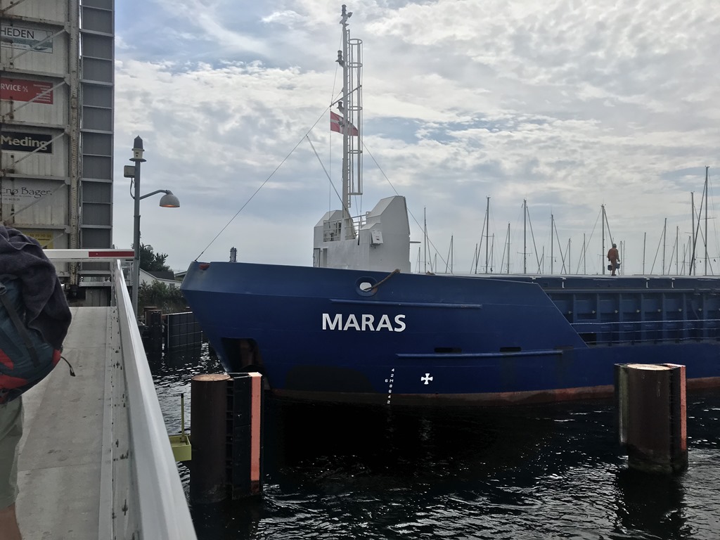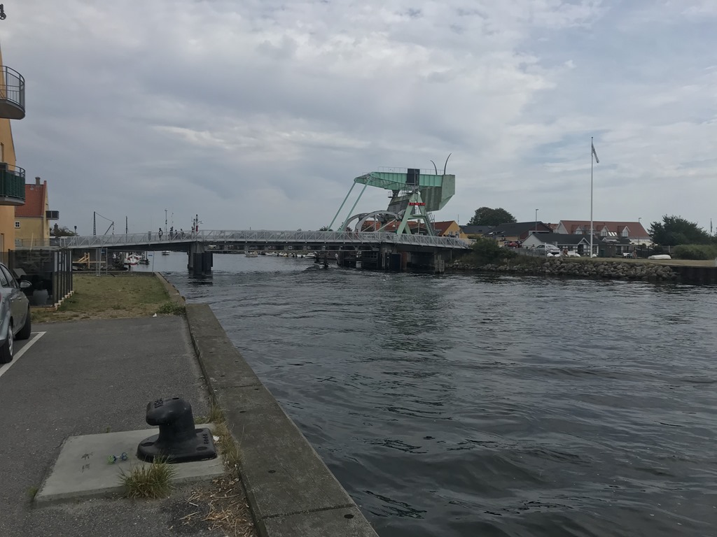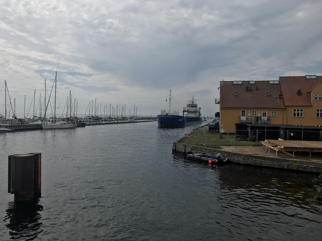 Vi går och tittar lite på museet och handlar lite dricka i affären innan vi går tillbaka mot husbilen. Då kommer det en stor båt som skall in till Naestved så vi får vänta tills den passerat.