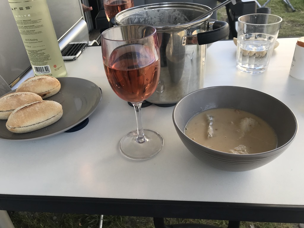 Till kvällen gör jag fisksoppa och värmer till några rundstycken.