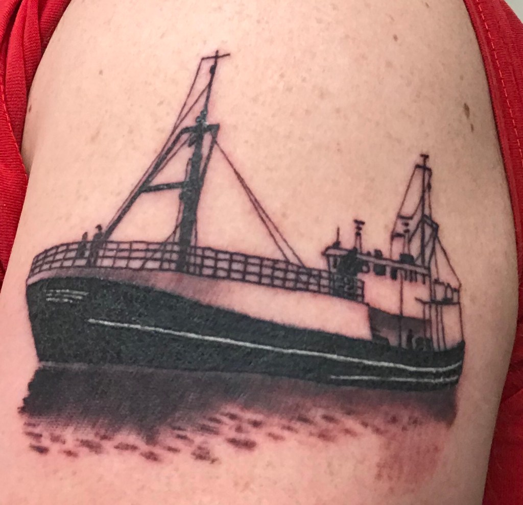 Sedan hade jag bråttom ner till Hamngatan 15 för att fortsätta på min tatuering. Jag ville ha med en båt som jag har anknytning till och hade med ett gammalt foto.